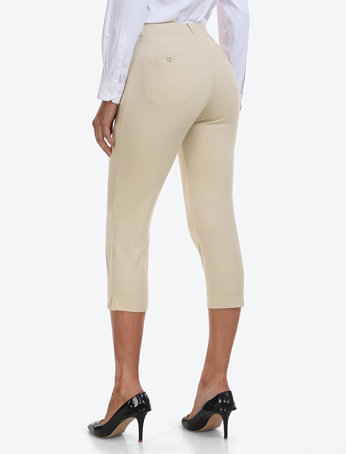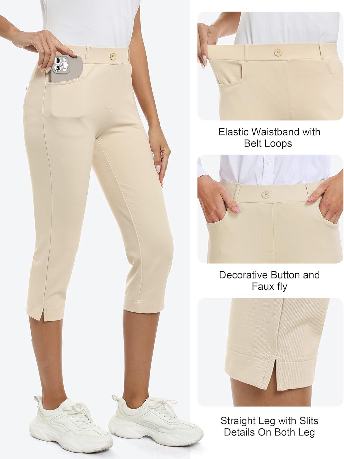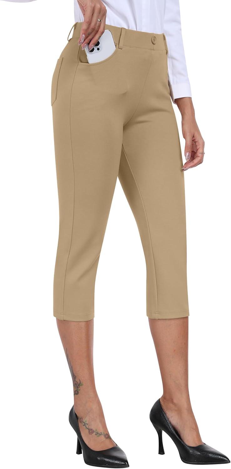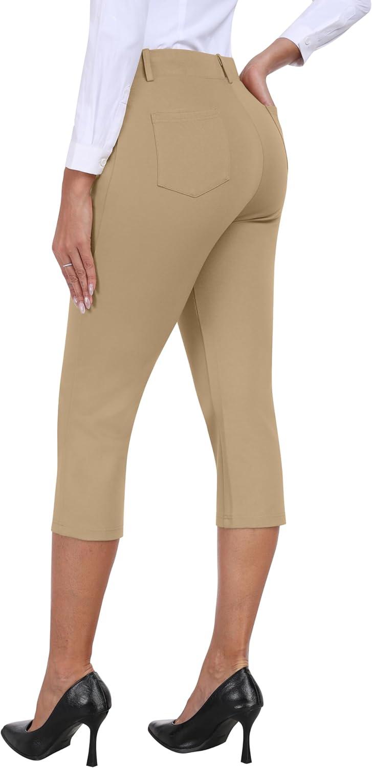 MoFiz Women’s Capri Pants Summer Pull-On Stretch Straight Leg Golf Yoga & Business Casual Dressy Cropped Pants with Pockets(Khaki)
