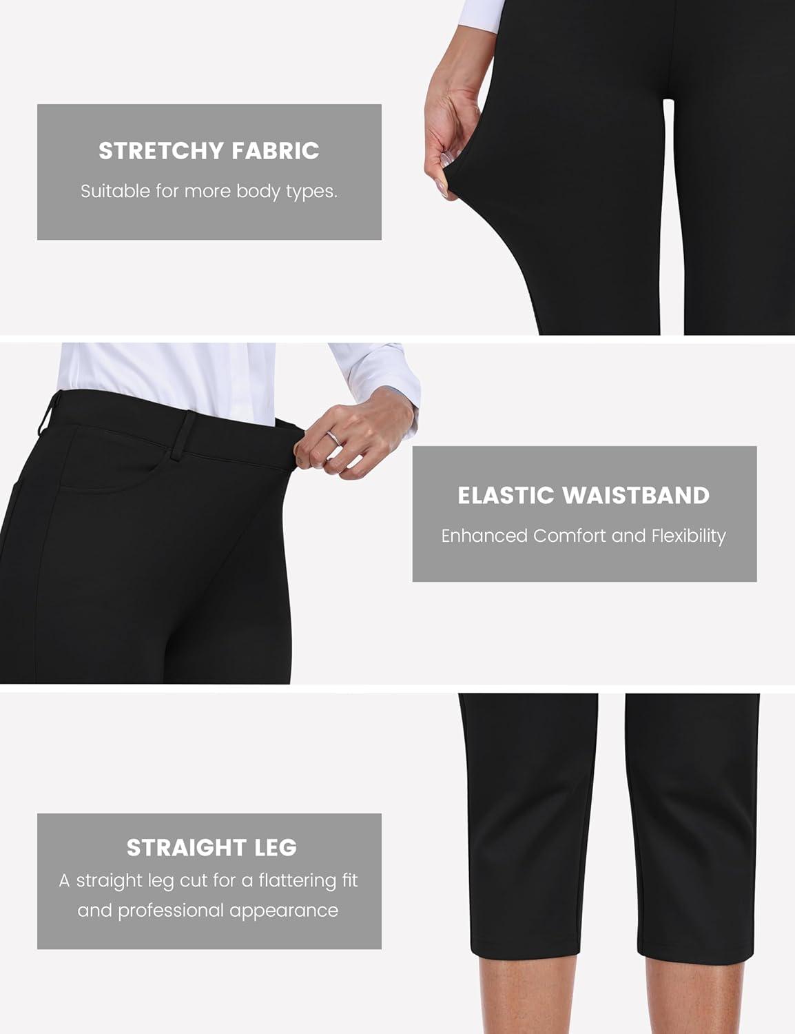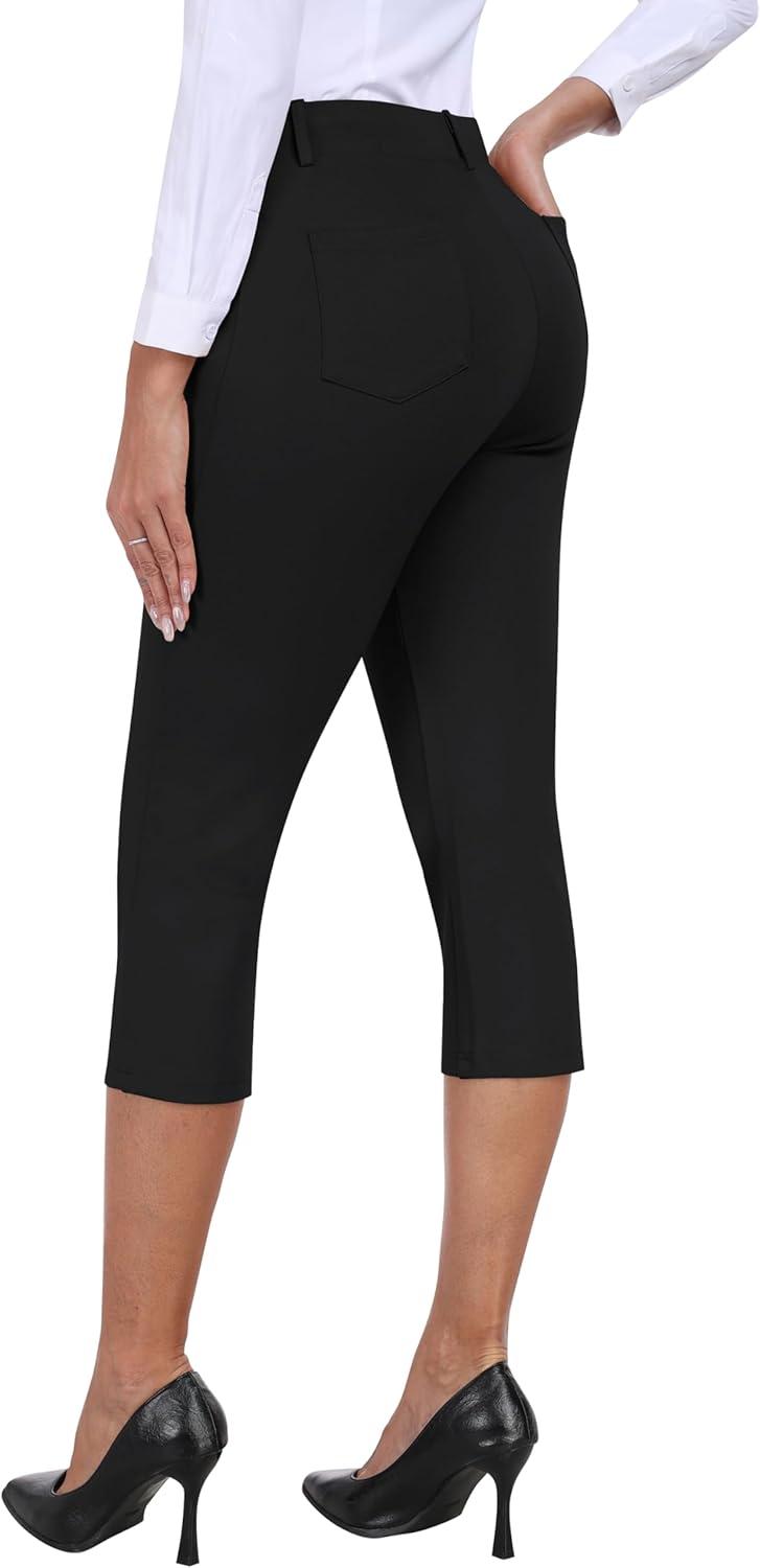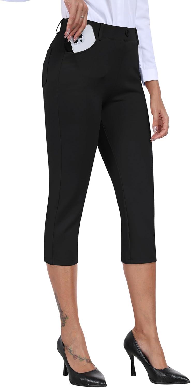 MoFiz Women’s Capri Pants Summer Pull-On Stretch Straight Leg Golf Yoga & Business Casual Dressy Cropped Pants with Pockets(Black)