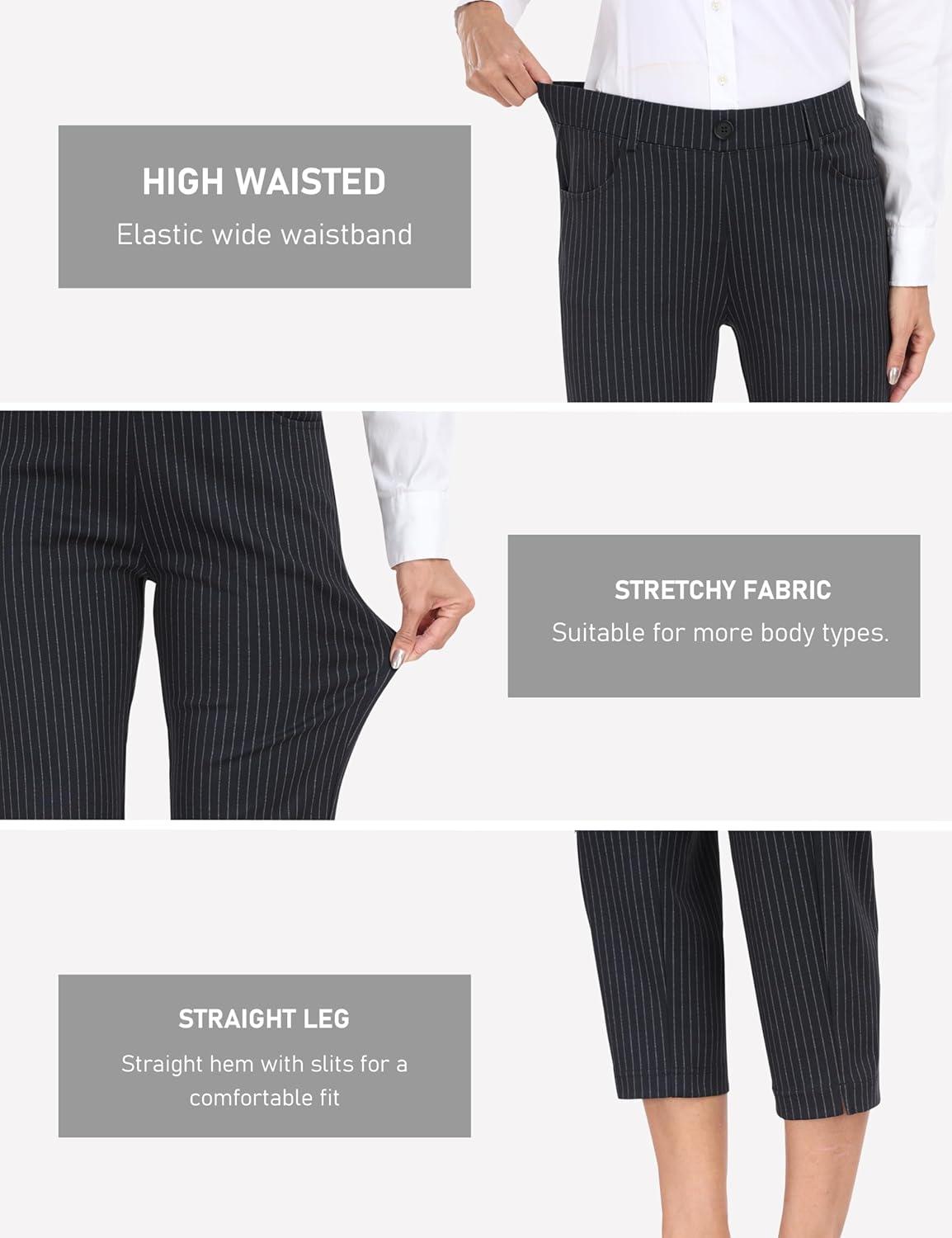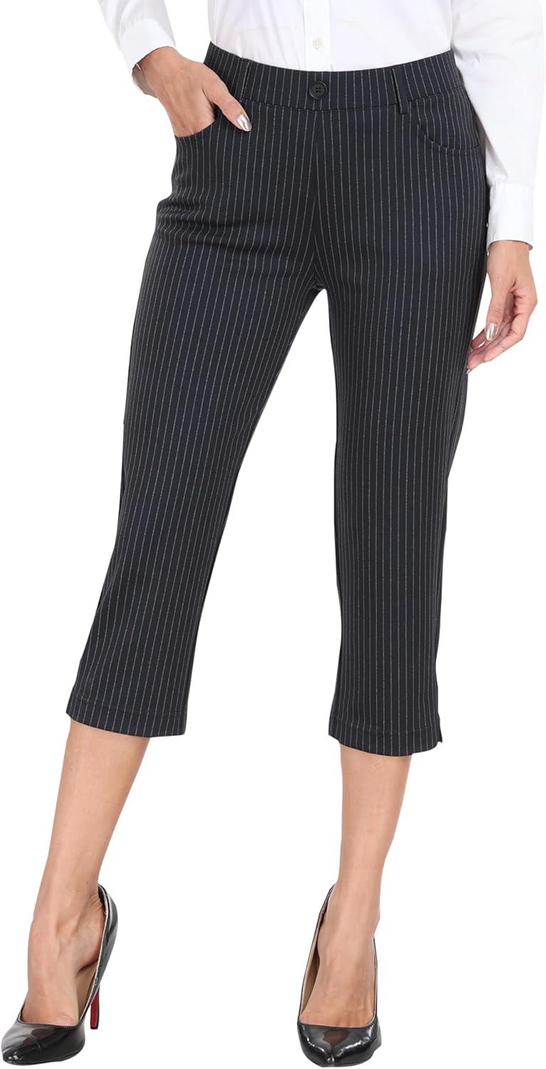 MoFiz Women’s Capri Pants Summer Pull-On Stretch Straight Leg Golf Yoga & Business Casual Dressy Cropped Pants with Pockets(Black Pinstripe)