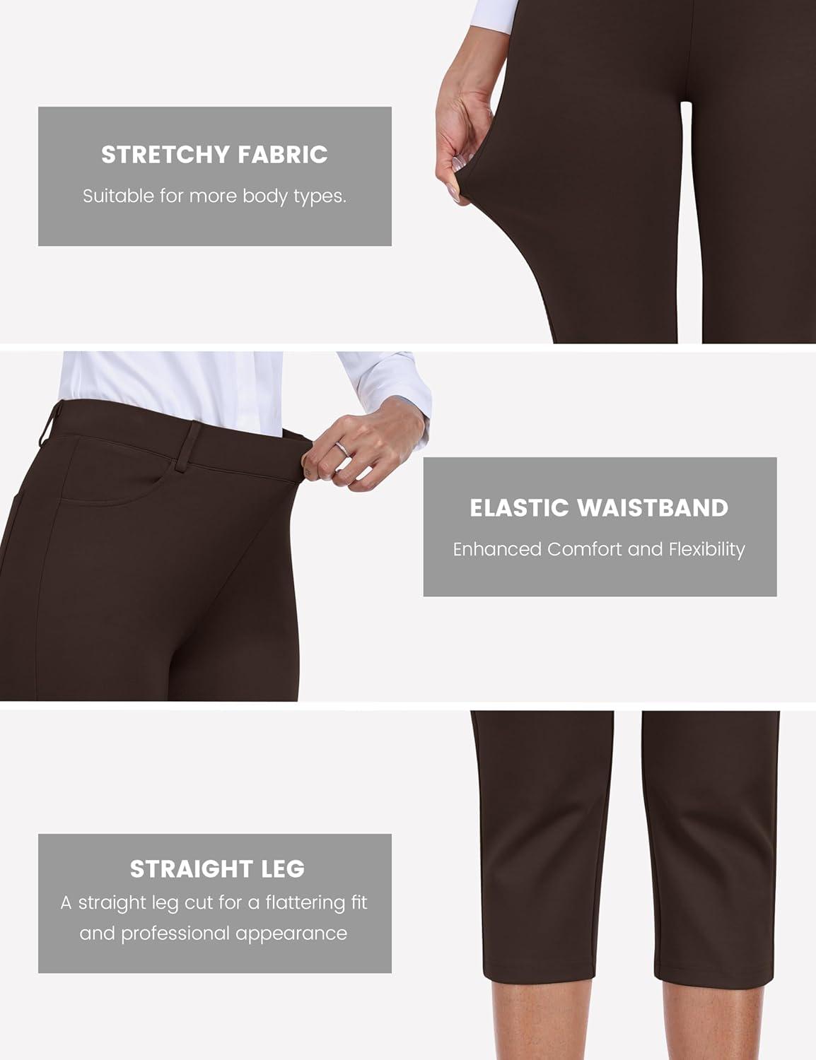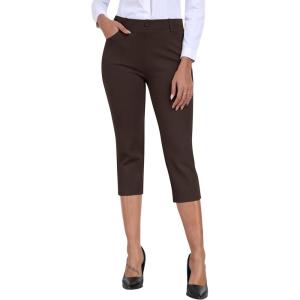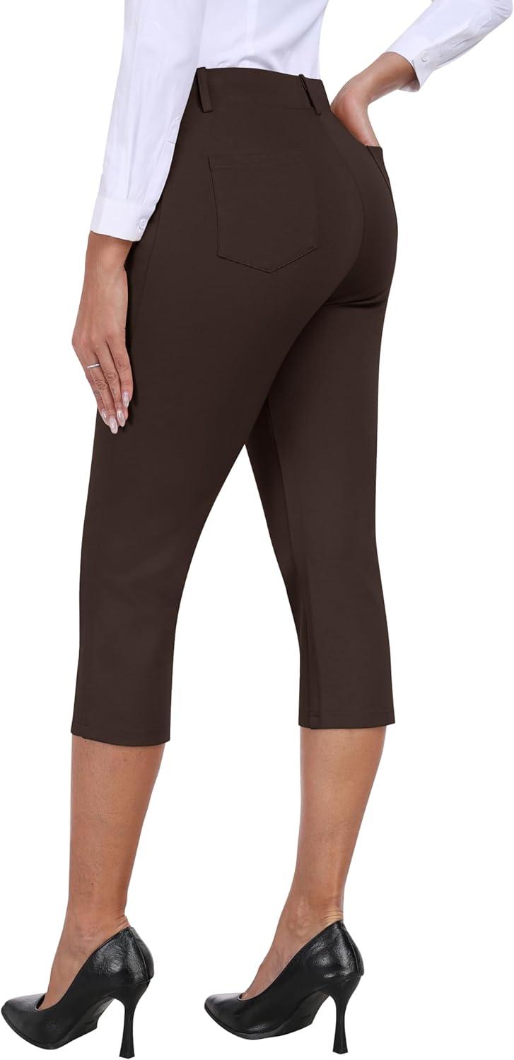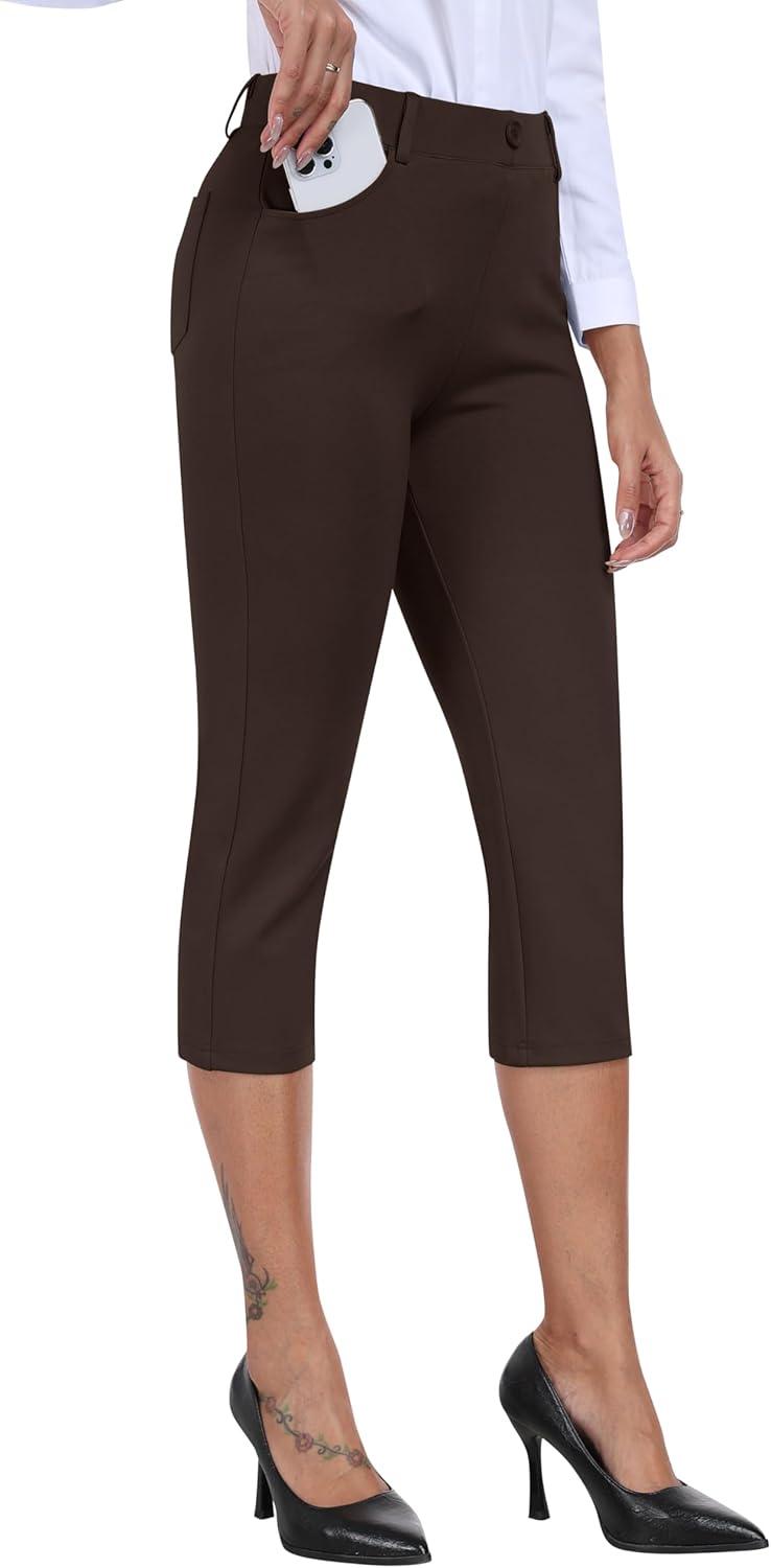 MoFiz Women’s Capri Pants Summer Pull-On Stretch Straight Leg Golf Yoga & Business Casual Dressy Cropped Pants with Pockets(Coffee Brown)