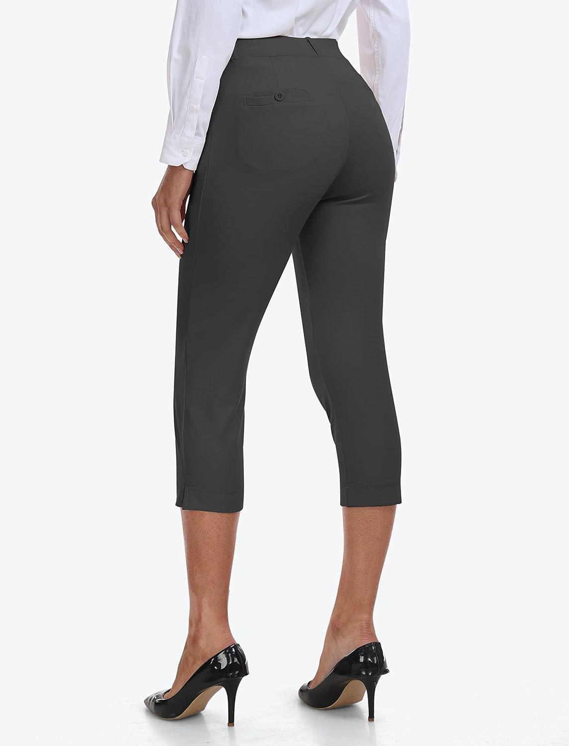 MoFiz Women’s Capri Pants Summer Pull-On Stretch Straight Leg Golf Yoga & Business Casual Dressy Cropped Pants with Pockets(Dark Gray)