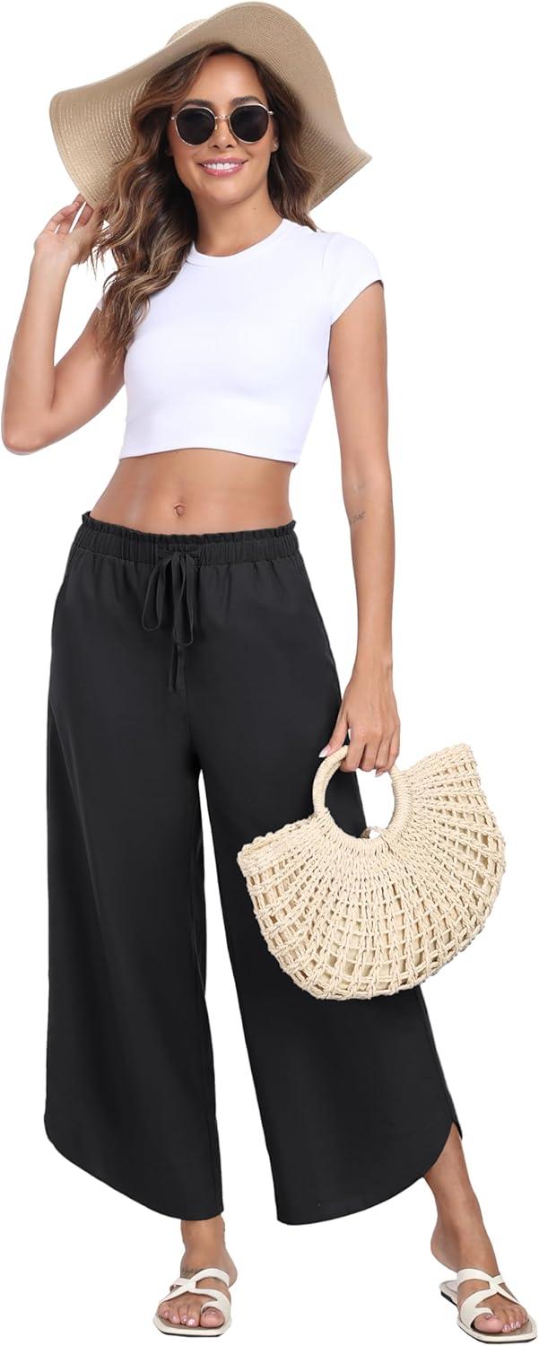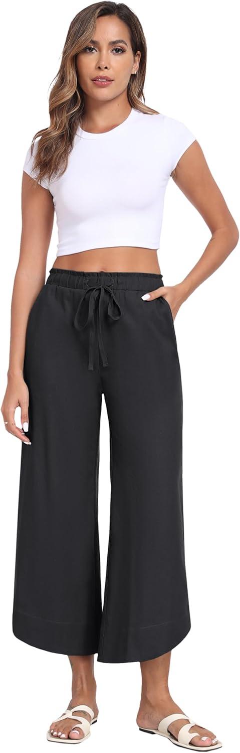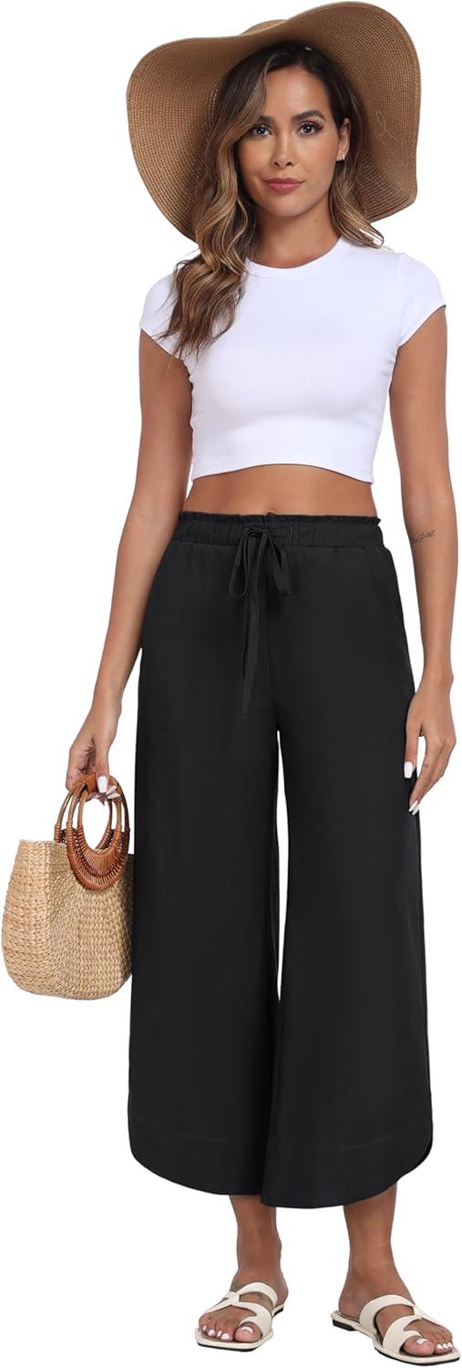 MoFiz Women Cotton Linen Pants Casual Loose Women Wide Leg Pants with Arc Legs Design Flowy Pants Beach Pants(A02-black)