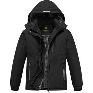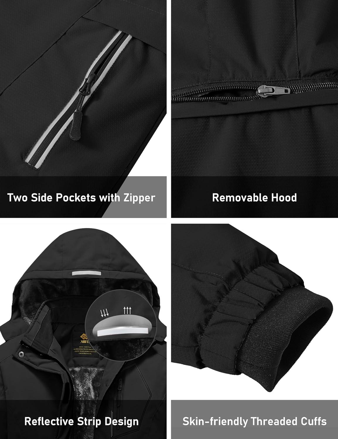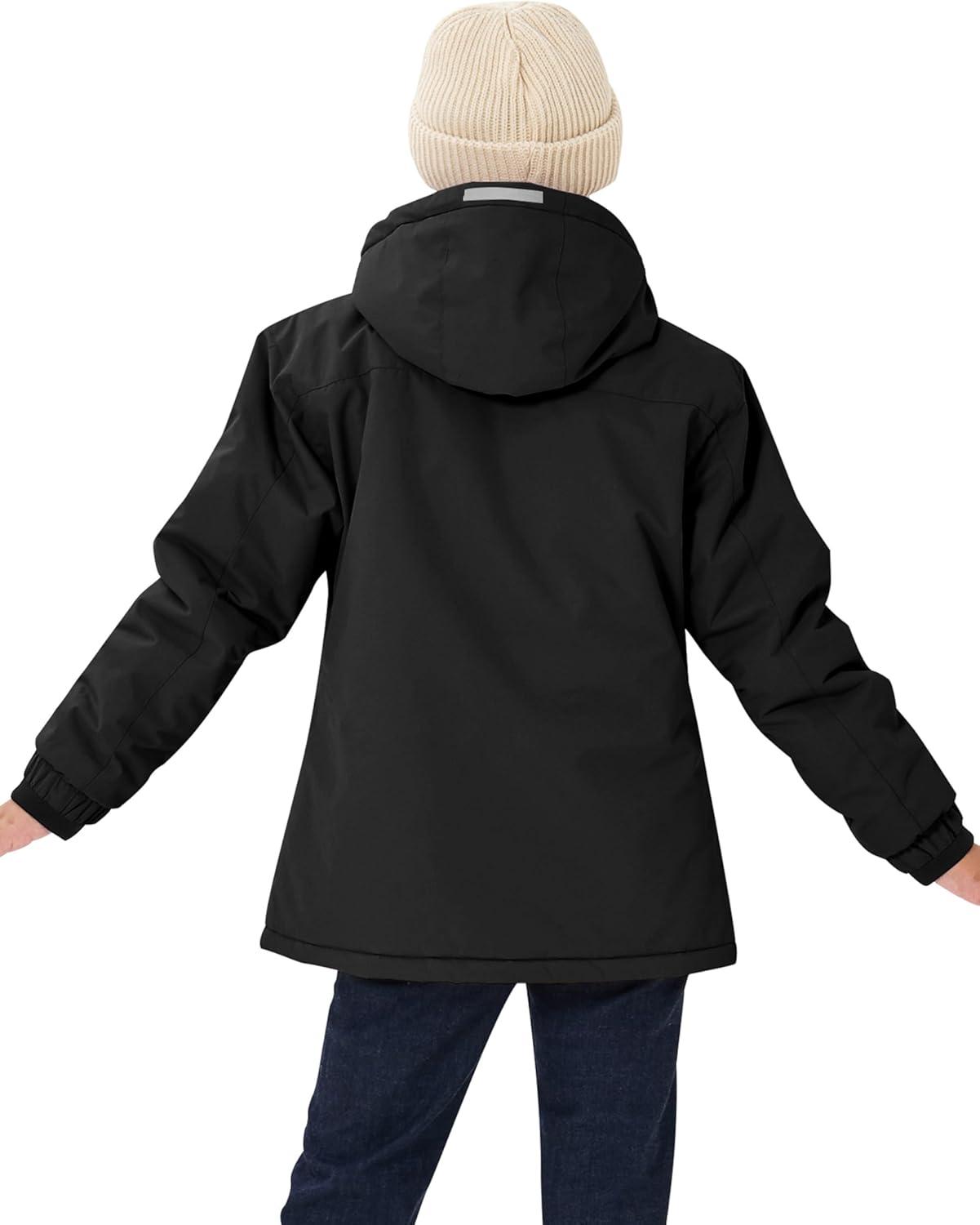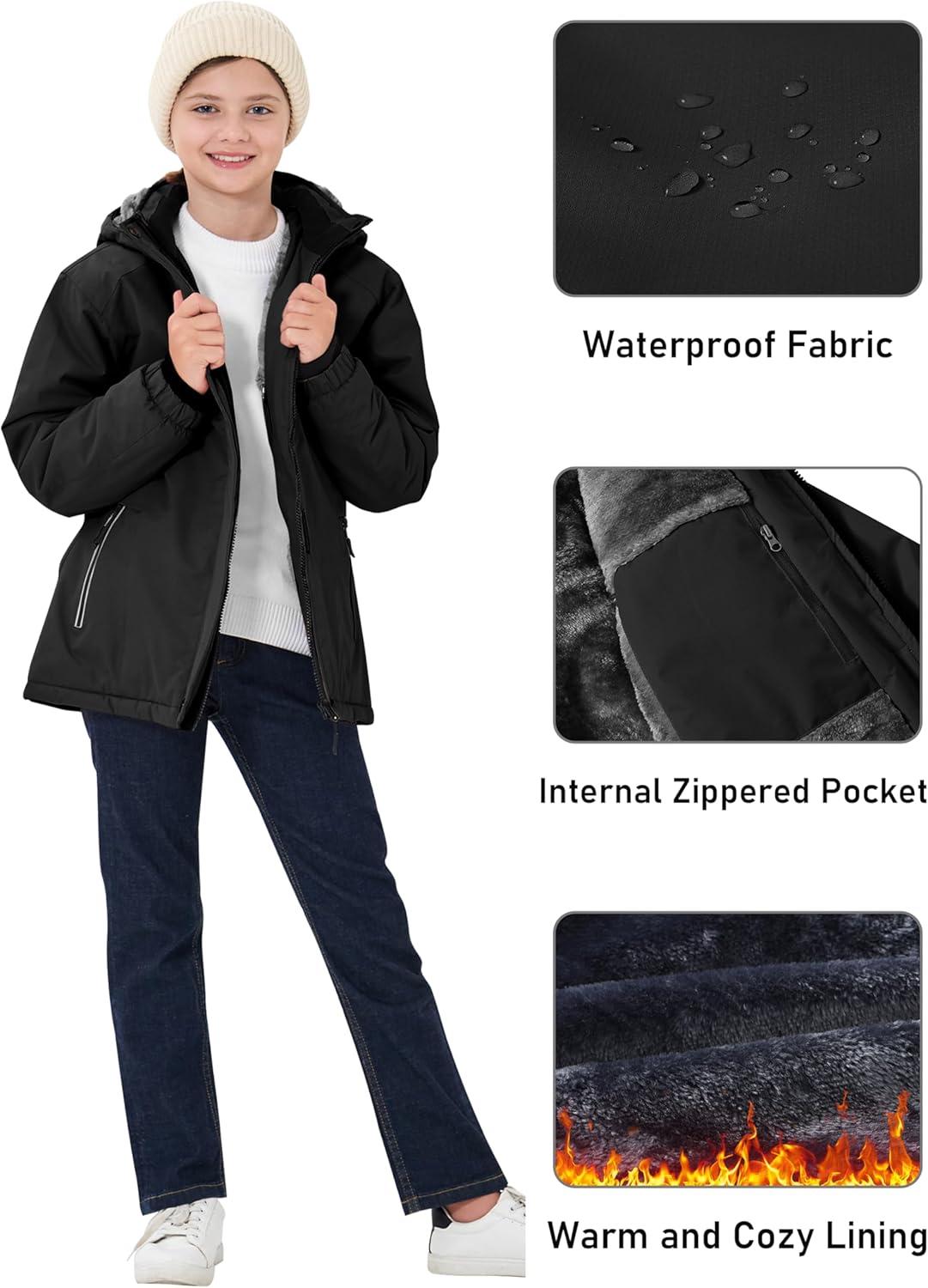 MoFiz Girls Ski Jacket Waterproof Fleece Lined Snowboard Jacket Warm Winter Snow Coats with Removable Hood(Black)