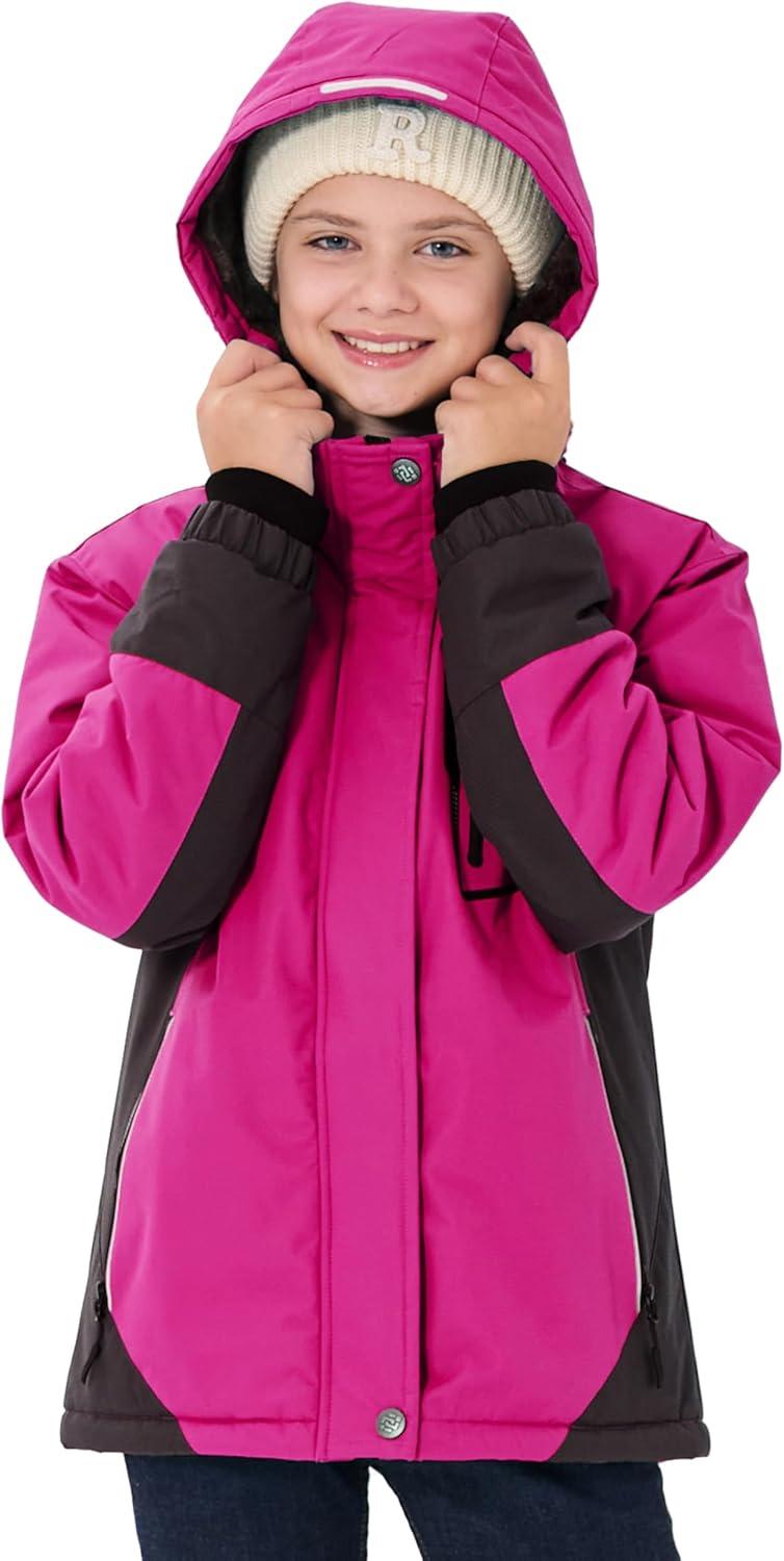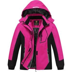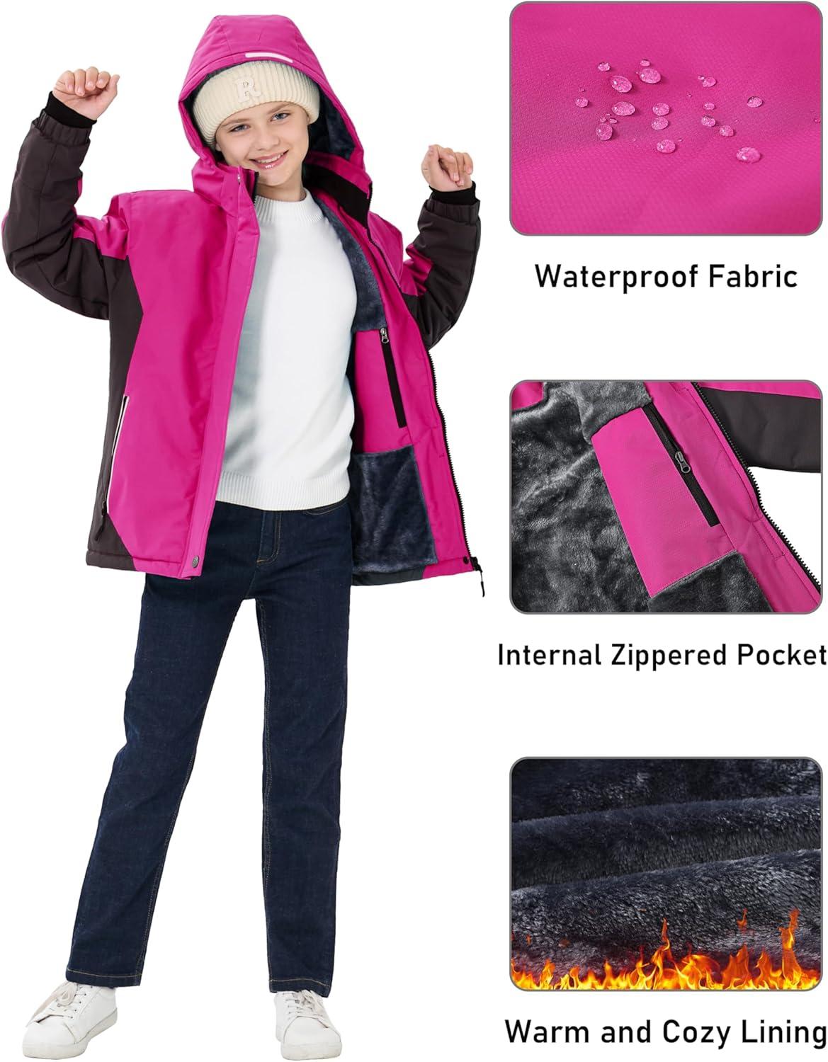 MoFiz Girls Ski Jacket Waterproof Fleece Lined Snowboard Jacket Warm Winter Snow Coats with Removable Hood(Rose Red)