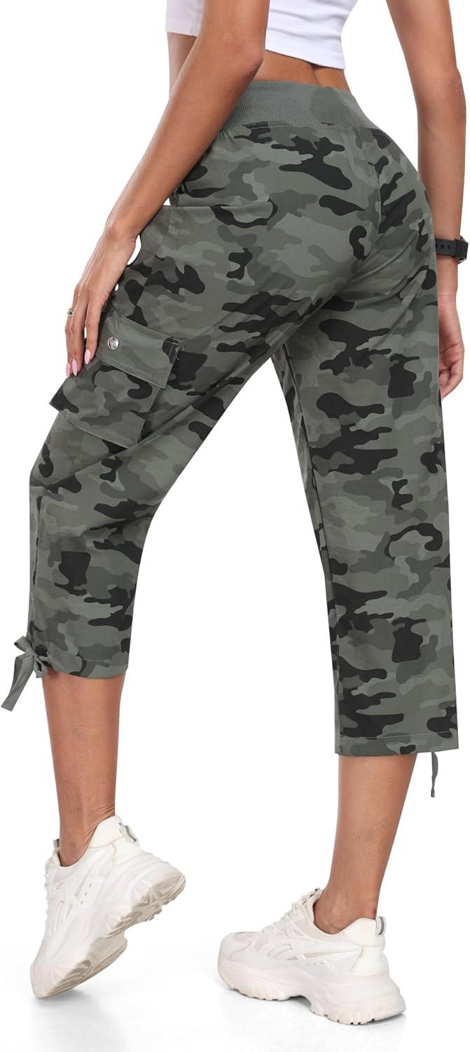 MoFiz Hiking Cargo Pants Women Summer 3/4 Long Lightweight Capri Outdoor Trousers Breathable with Zipper Pocket(Camo Green)