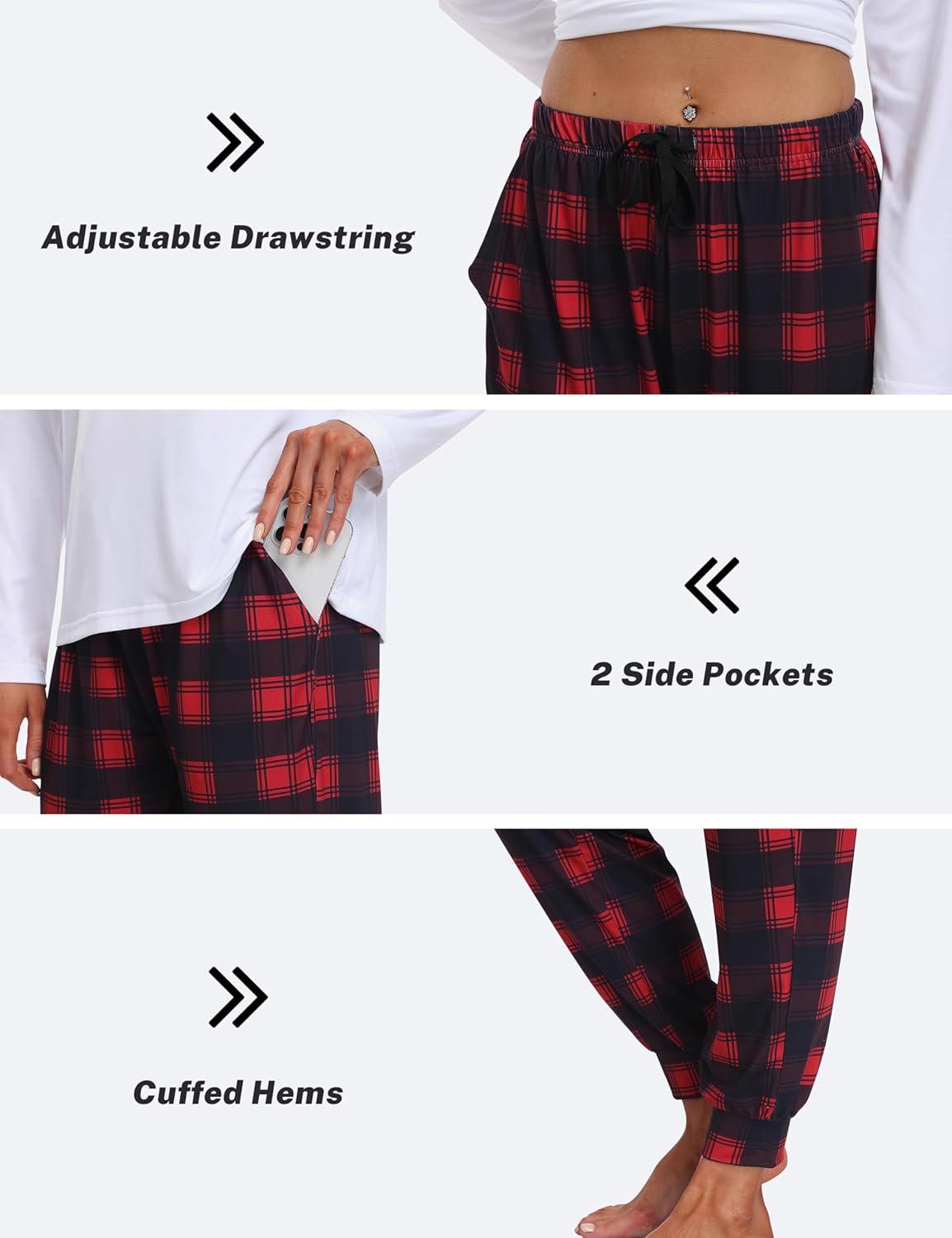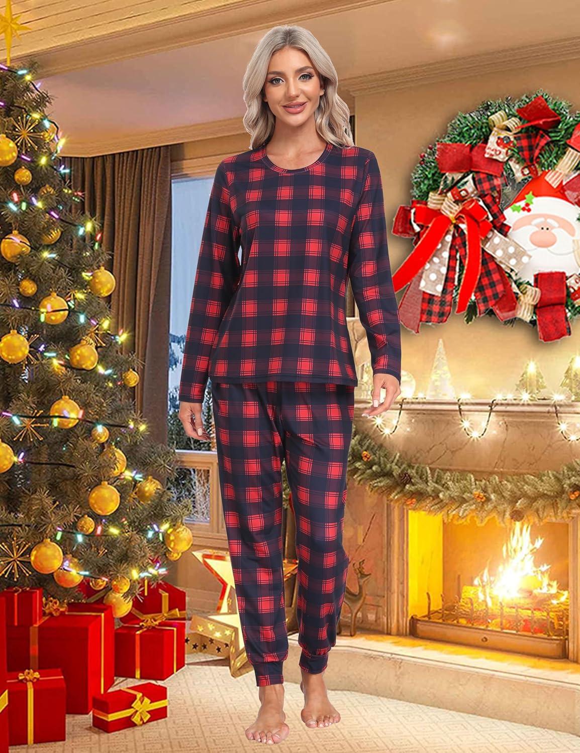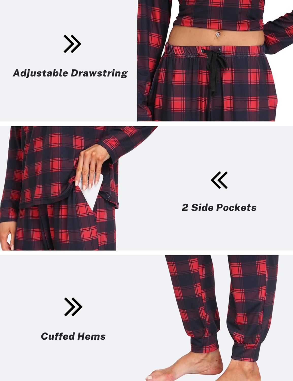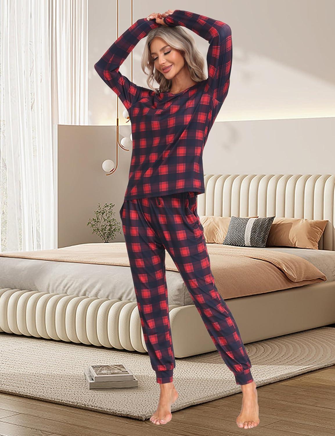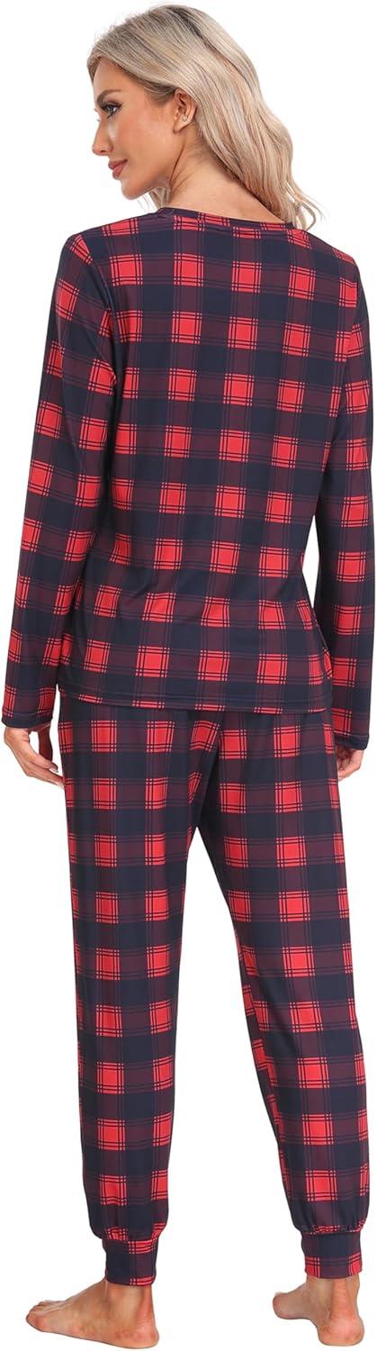 MoFiz Women’s Long Sleeve Pajamas Sets with Plaid Pants Comfy Sleepwear Nightwear 2 Piece Pjs with Pockets(Aa-red Plaid)