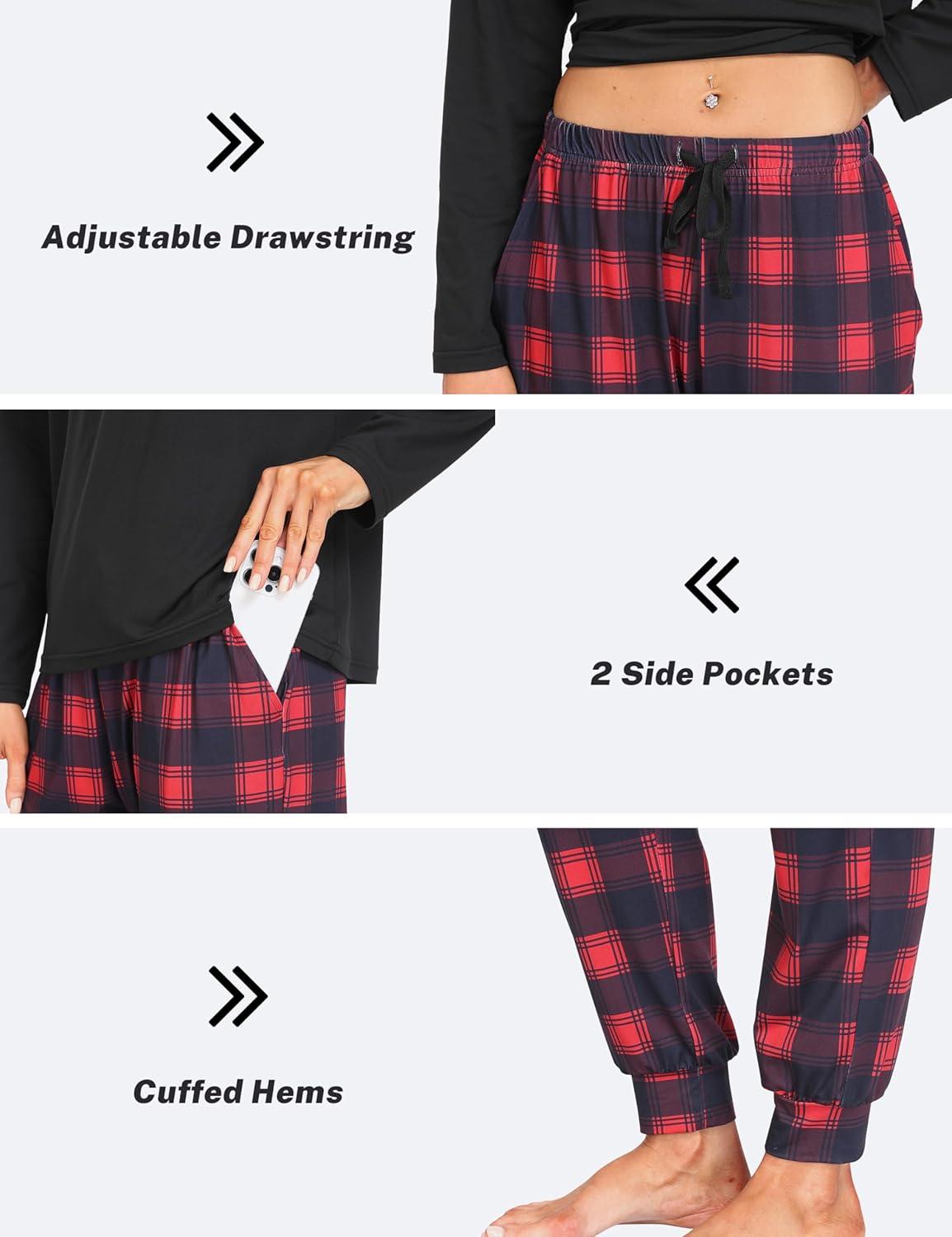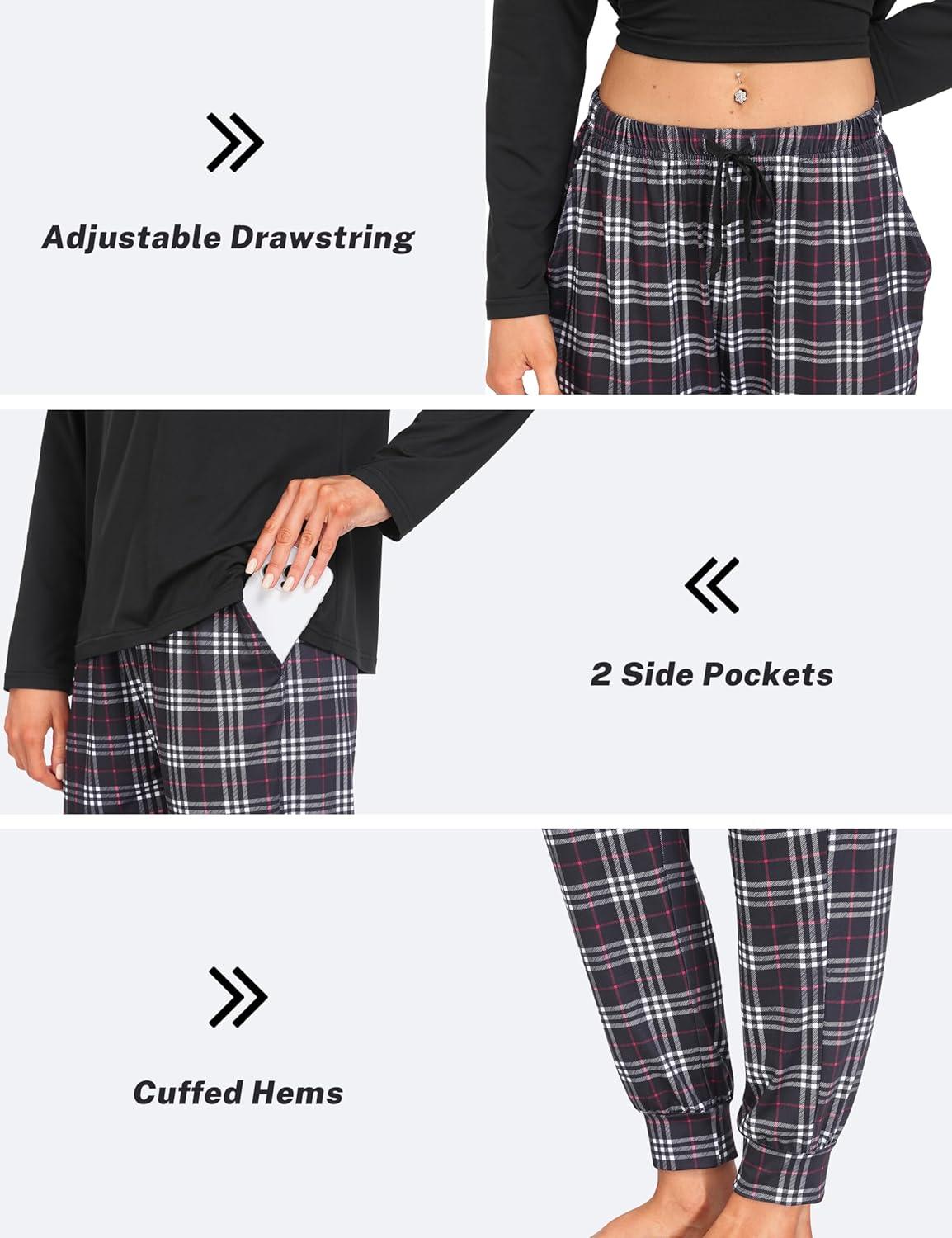 MoFiz Women’s Long Sleeve Pajamas Sets with Plaid Pants Comfy Sleepwear Nightwear 2 Piece Pjs with Pockets(Ac-black)