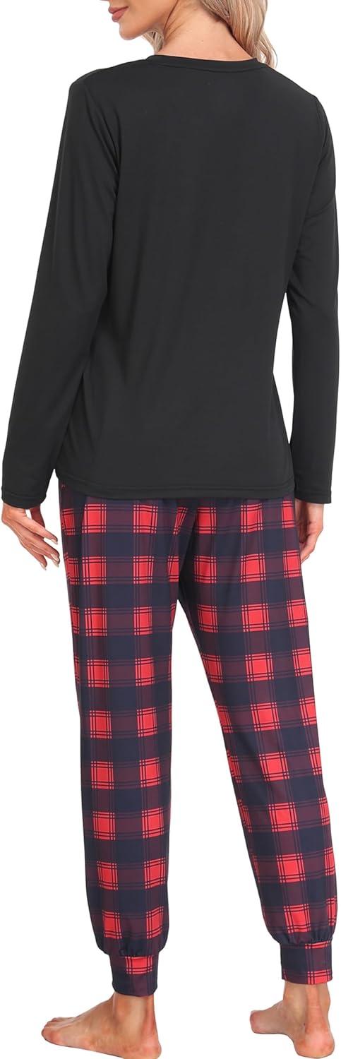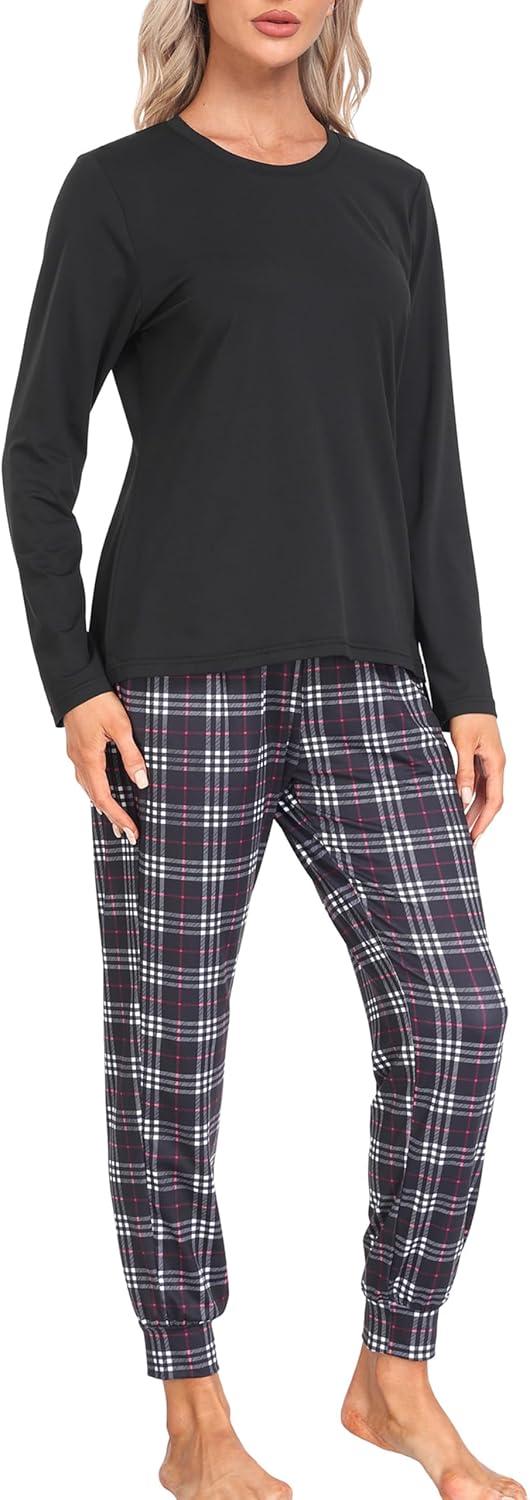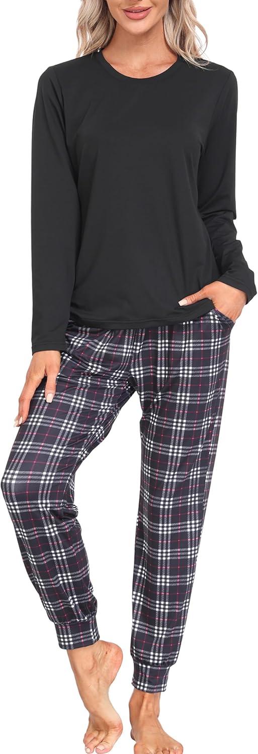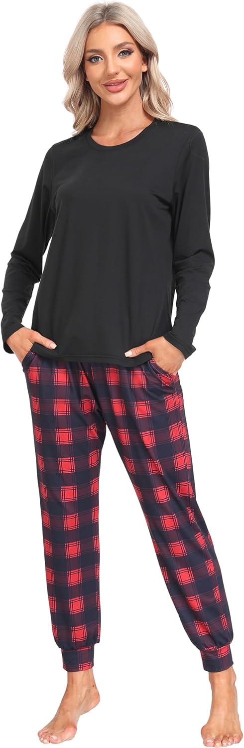 MoFiz Women’s Long Sleeve Pajamas Sets with Plaid Pants Comfy Sleepwear Nightwear 2 Piece Pjs with Pockets(Ab-black)