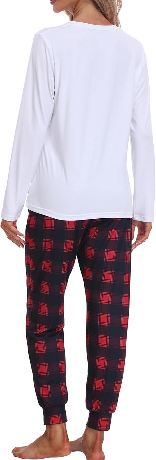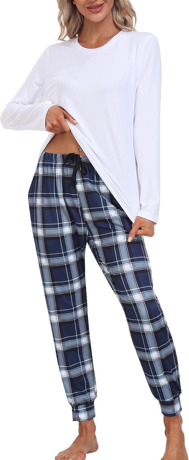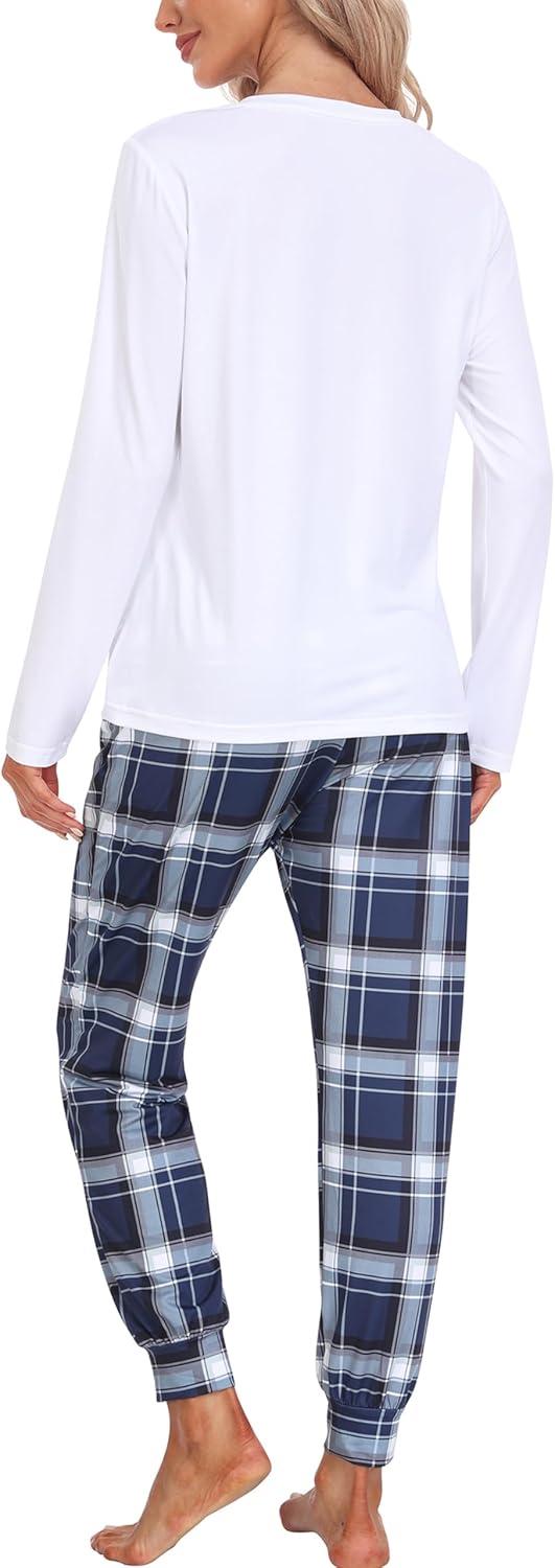 MoFiz Women’s Long Sleeve Pajamas Sets with Plaid Pants Comfy Sleepwear Nightwear 2 Piece Pjs with Pockets(Ae-white)