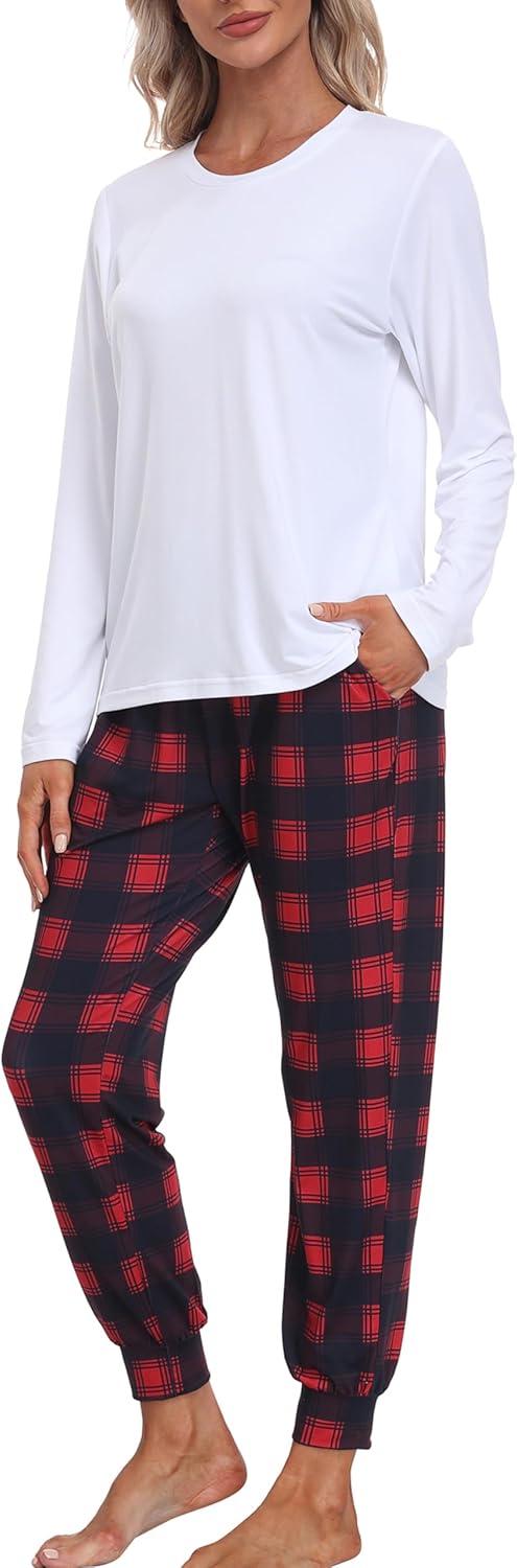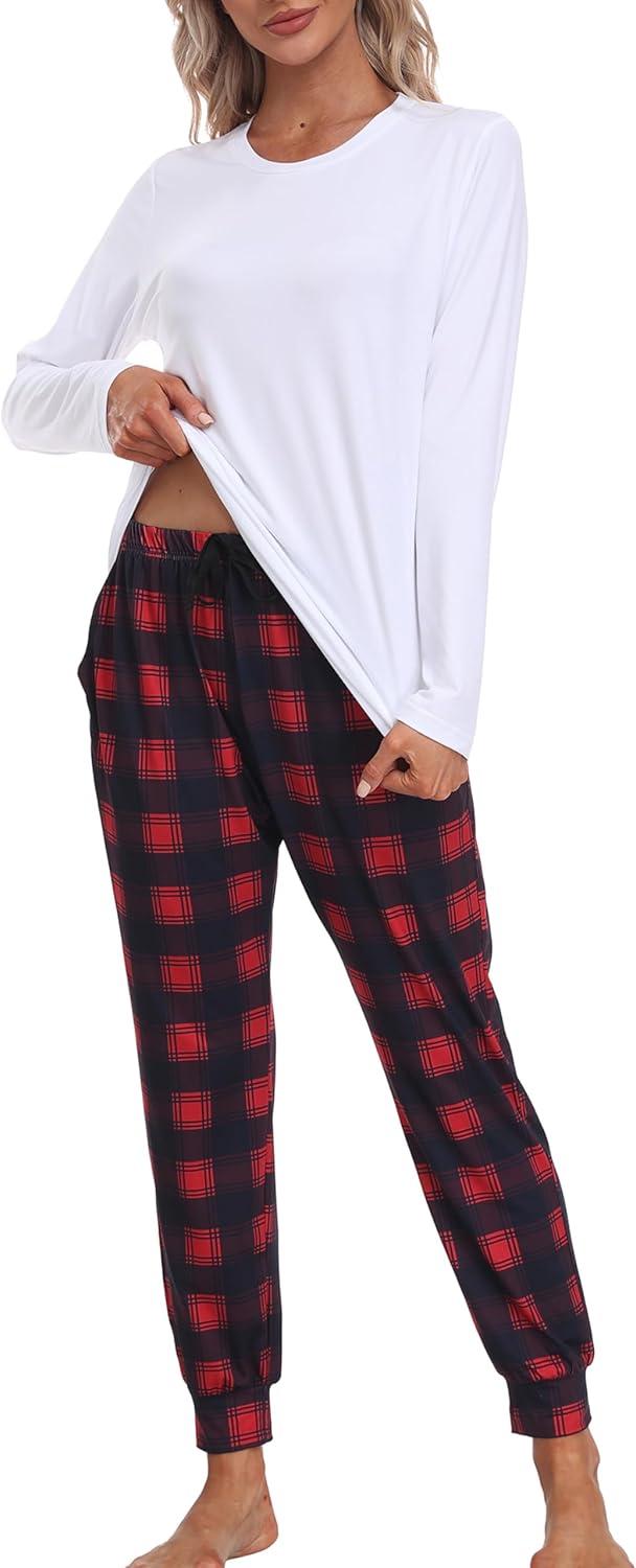 MoFiz Women’s Long Sleeve Pajamas Sets with Plaid Pants Comfy Sleepwear Nightwear 2 Piece Pjs with Pockets(Ad-white)