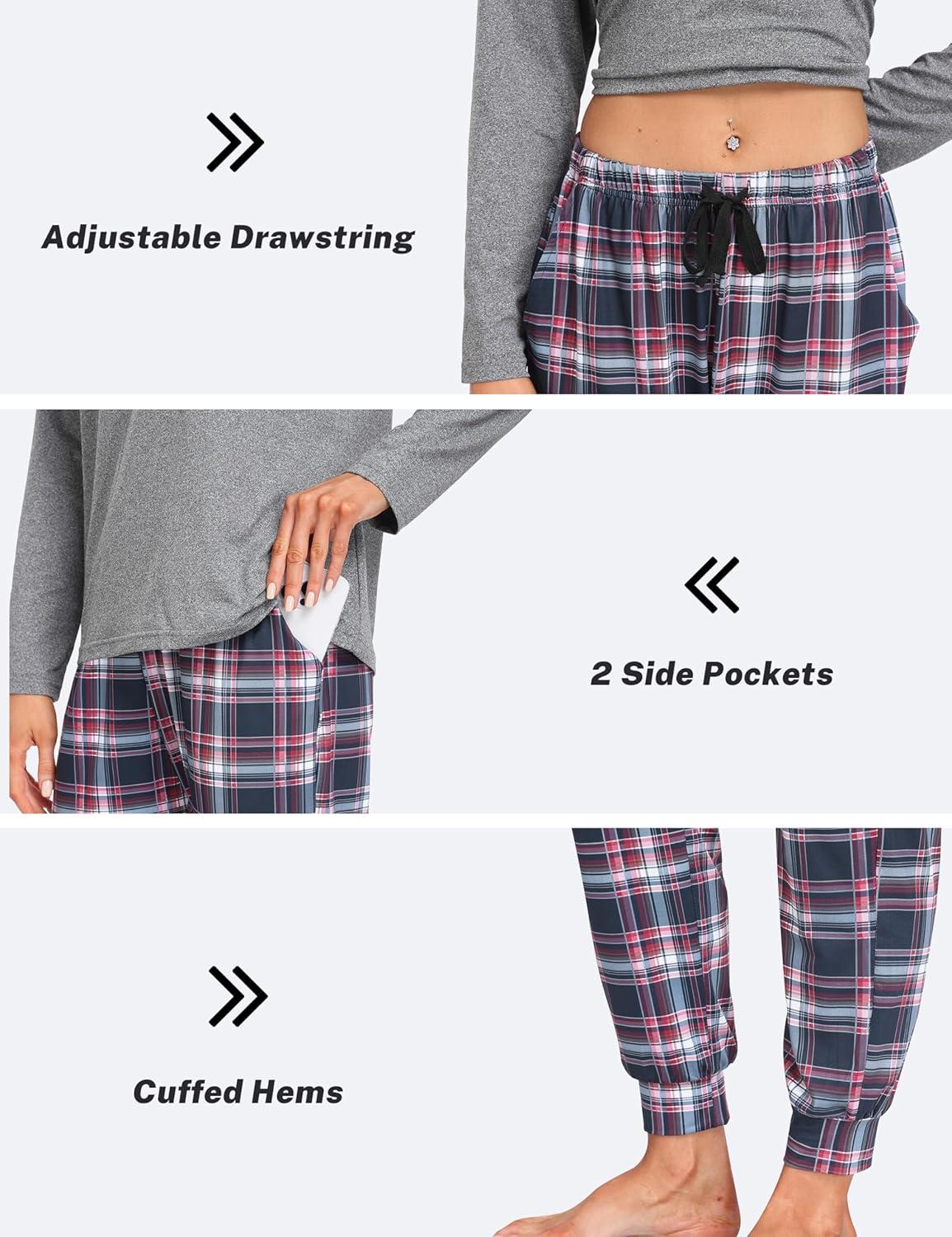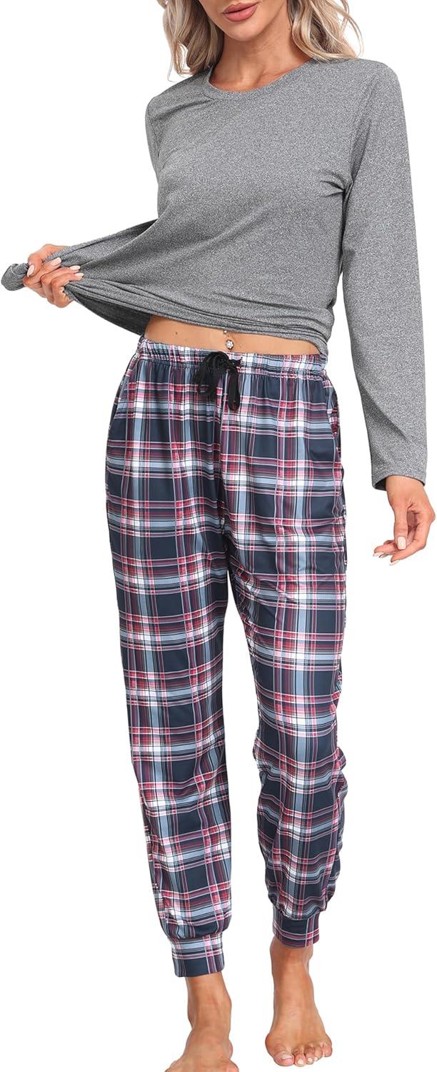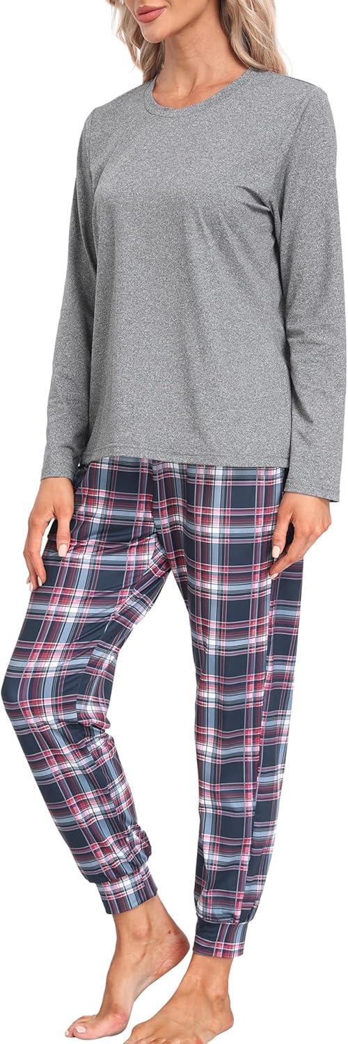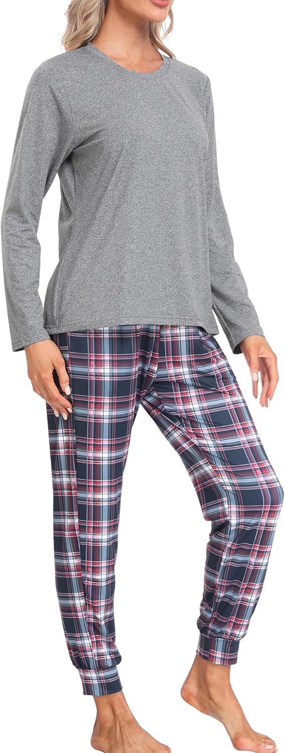 MoFiz Women’s Long Sleeve Pajamas Sets with Plaid Pants Comfy Sleepwear Nightwear 2 Piece Pjs with Pockets(Ag-grey)