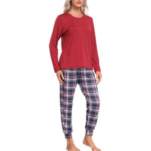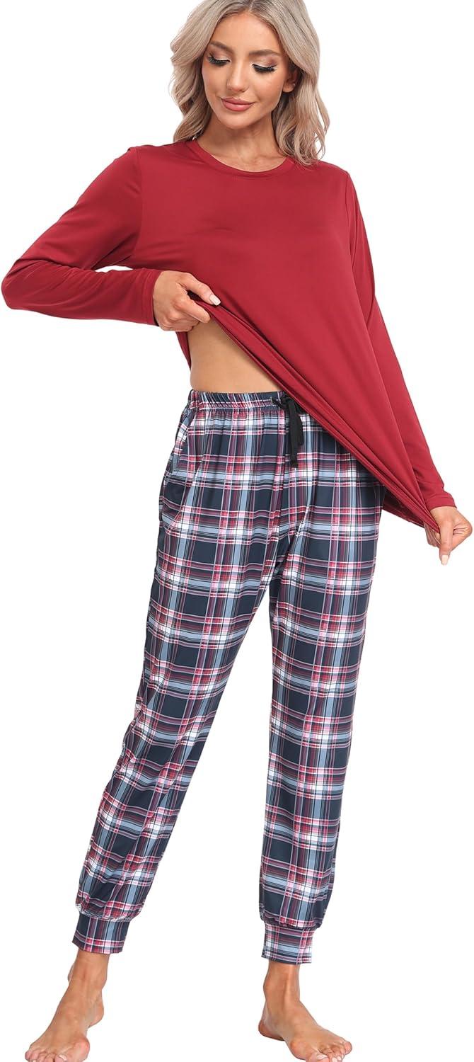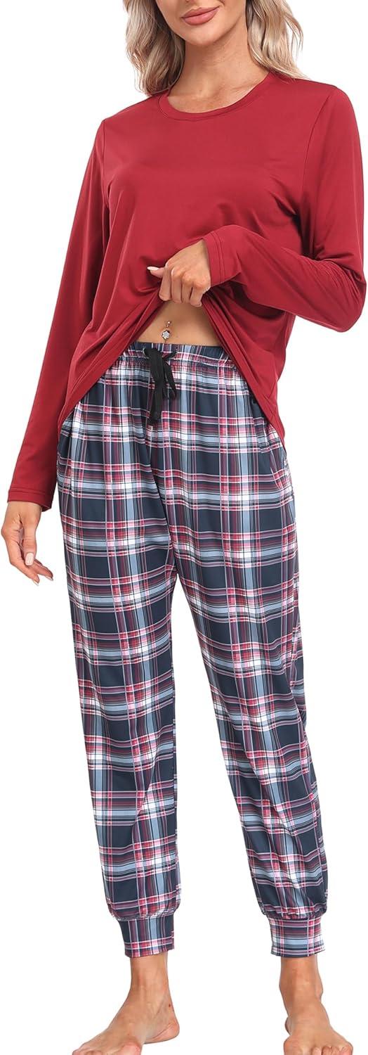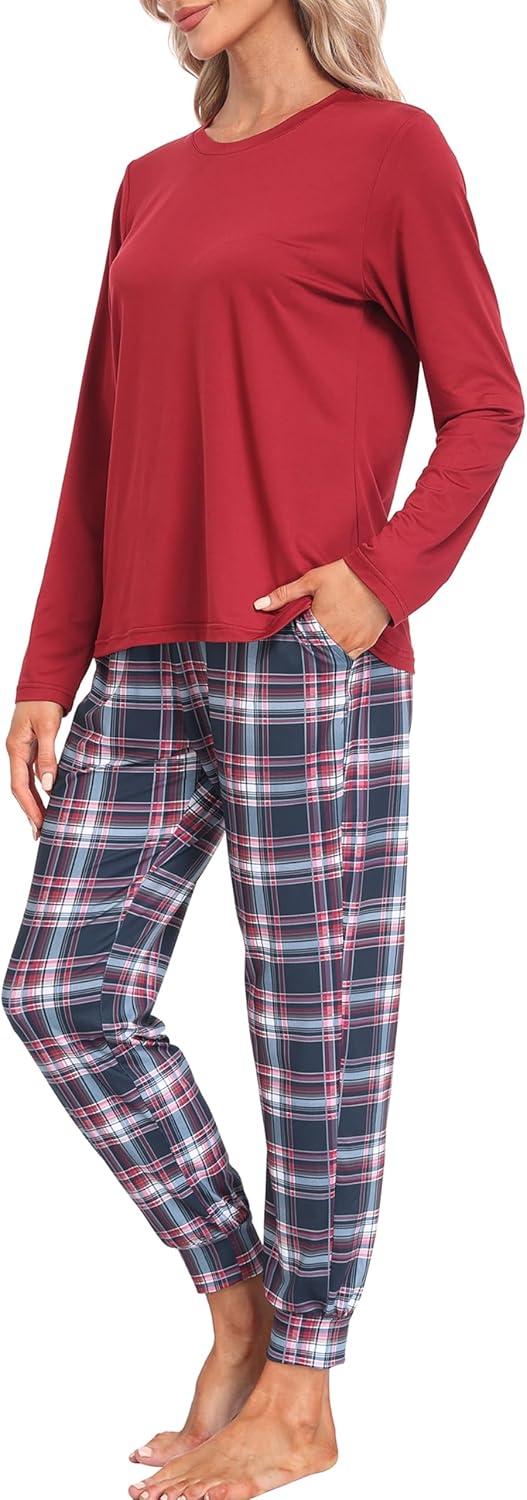 MoFiz Women’s Long Sleeve Pajamas Sets with Plaid Pants Comfy Sleepwear Nightwear 2 Piece Pjs with Pockets(Wine Red)