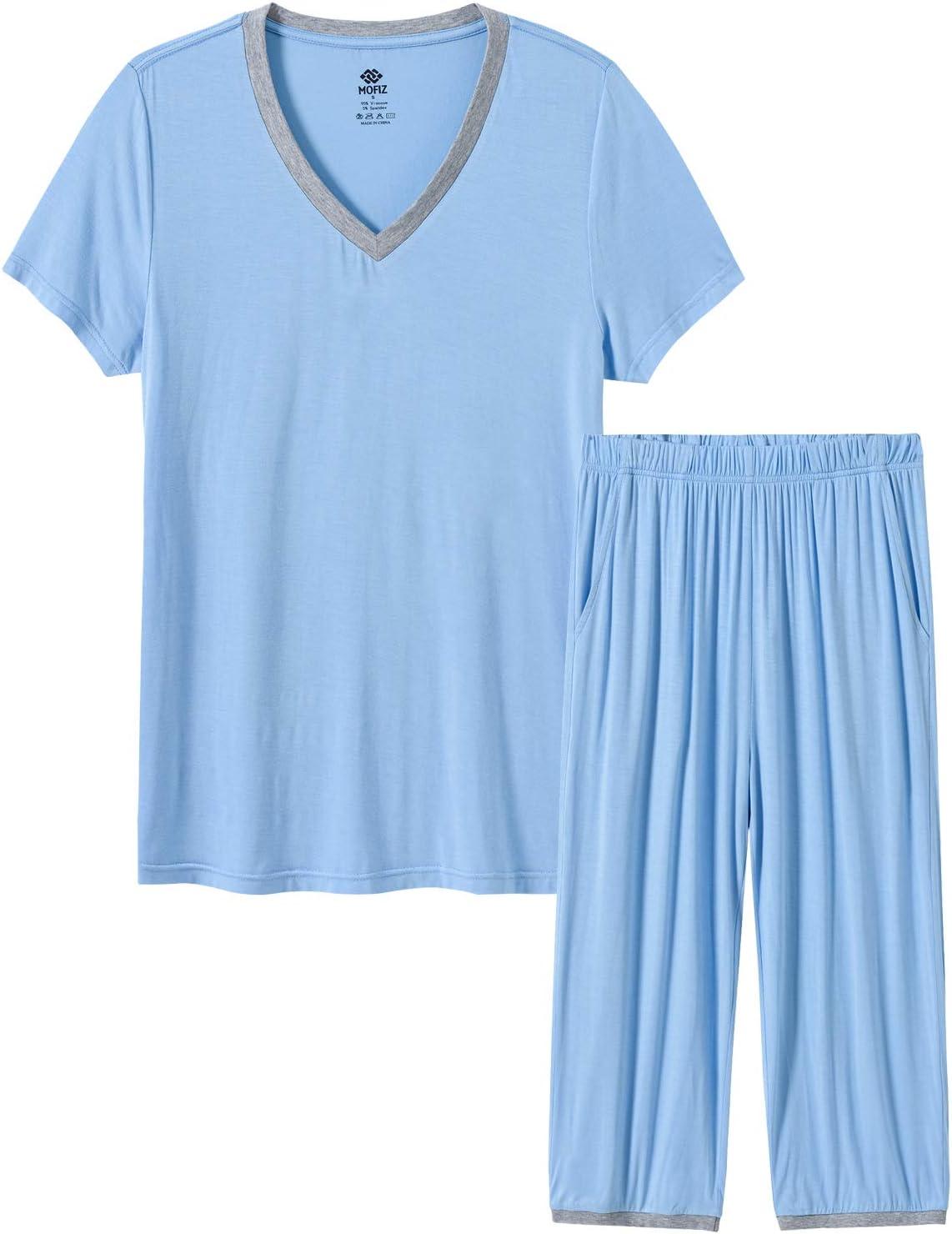 JINSHI Women’s Pajamas Set Short Sleeve Top and Capri Pants Lightweight Sleepwear Comfy Pjs Lounge Set with Pockets(Blue 2)
