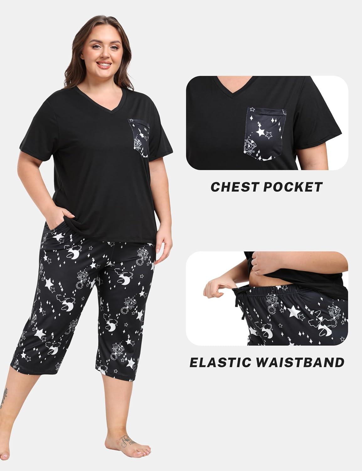 JINSHI Women’s Plus Size Pajama Sets Short Sleeve Pjs Set V Neck Tops & Capri Pants Sleepwear 2 Piece Lounge Set XL-5XL(Sky Black)