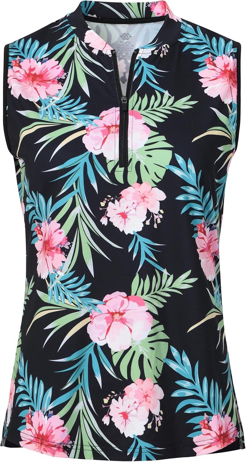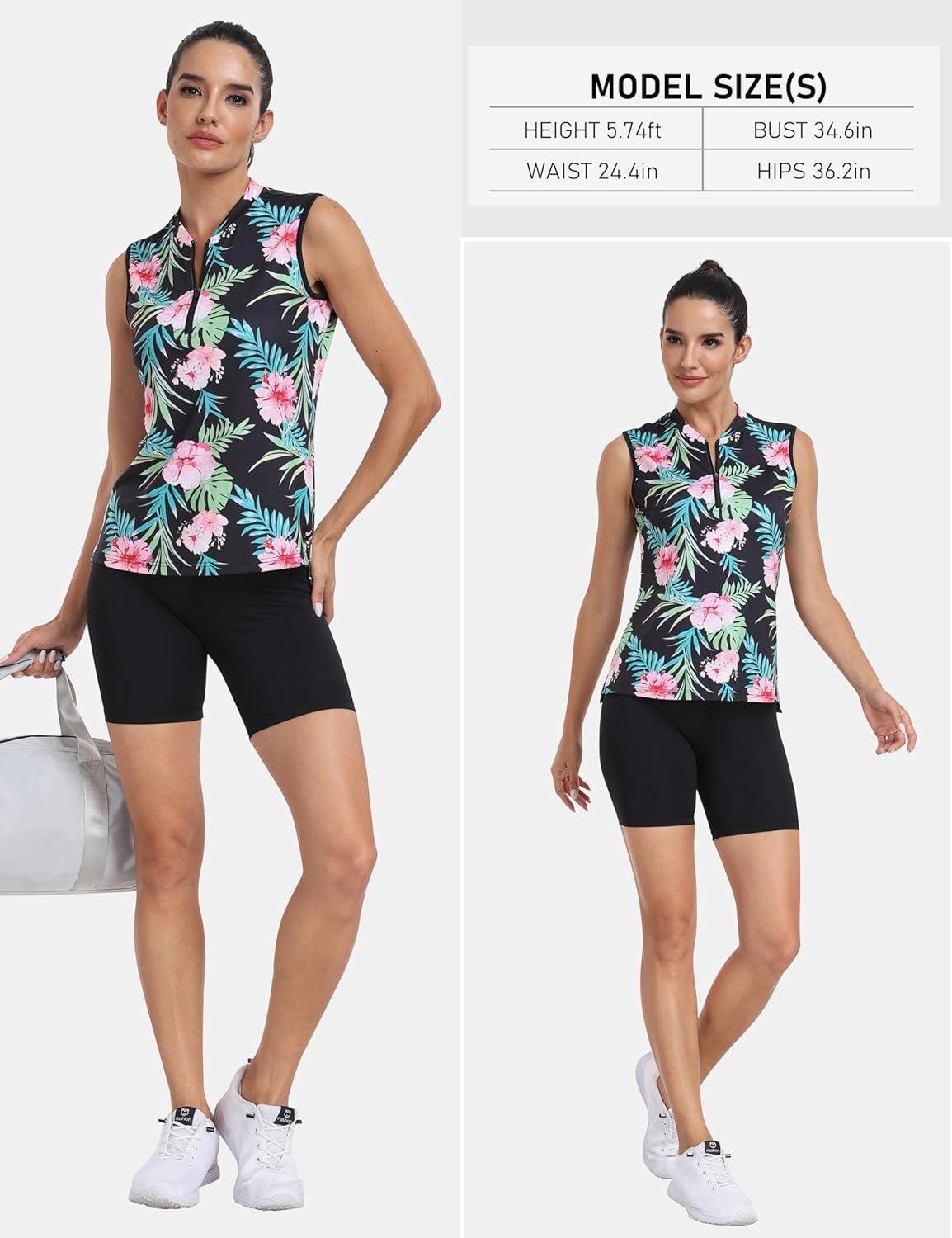 JINSHI Women’s Sleeveless Golf Shirts Tennis Shirt Quick Dry Pickleball Shirts UPF 50+ Sportswear T-Shirts with Zipper(B01-black Floral)