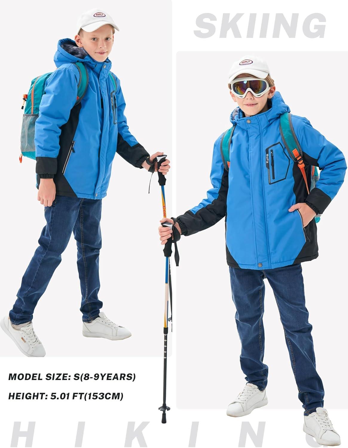 MoFiz Boys Waterproof Skiing Jacket Kids Hooded Fleece Winter Snowboard Jackets Windproof Warm Outerwear with Zip Pockets(Blue and Black)
