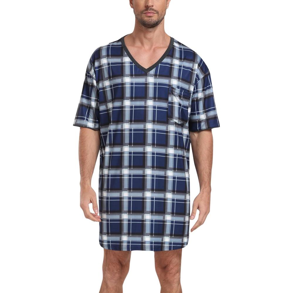 MoFiz Men’s Nightshirt Soft Pajamas V Neck Short Sleeve Nightgown Loose Sleepwear Nightwear Comfy Sleep Shirt S-3XL(Plaid-59)
