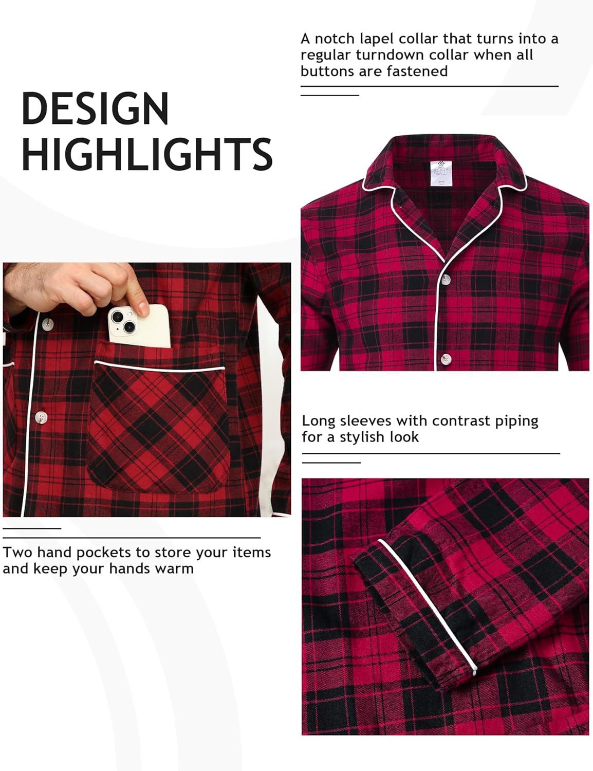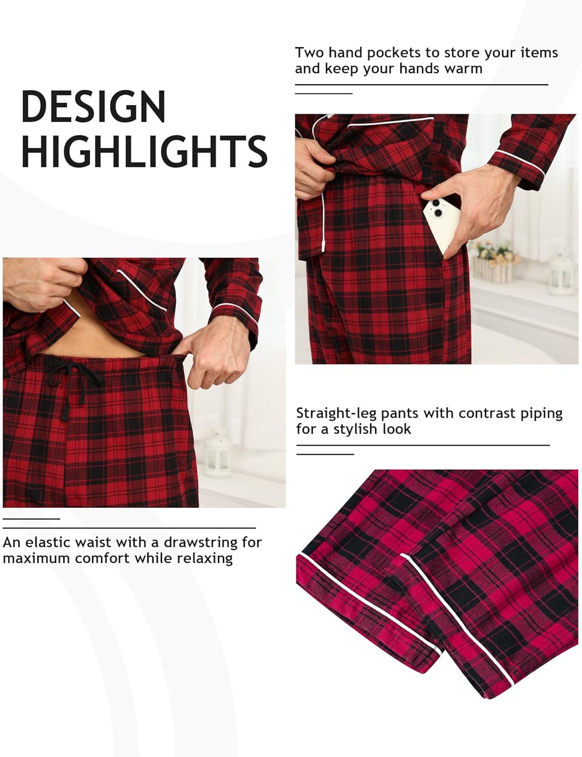MoFiz Mens Pajama Set Soft Cotton Button Down Notched Collar Pjs Long Sleeve 2 Piece Sleepwear Lounge Nightwear with Pocket(58-plaid)