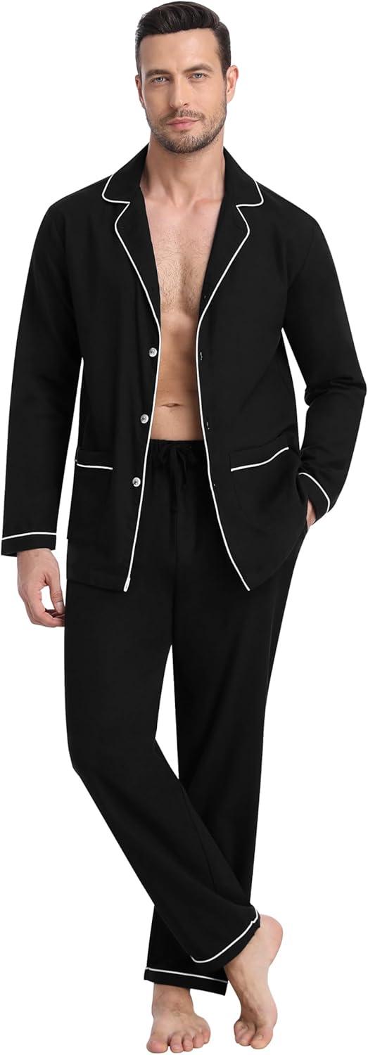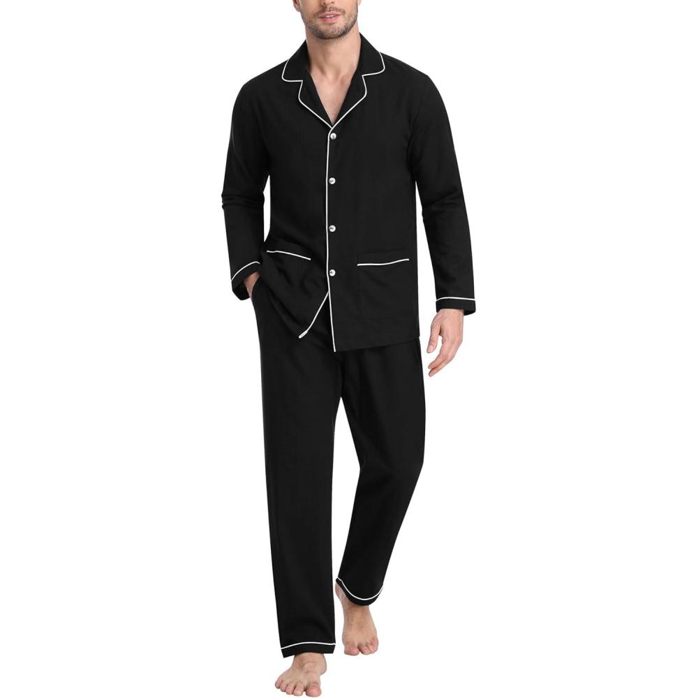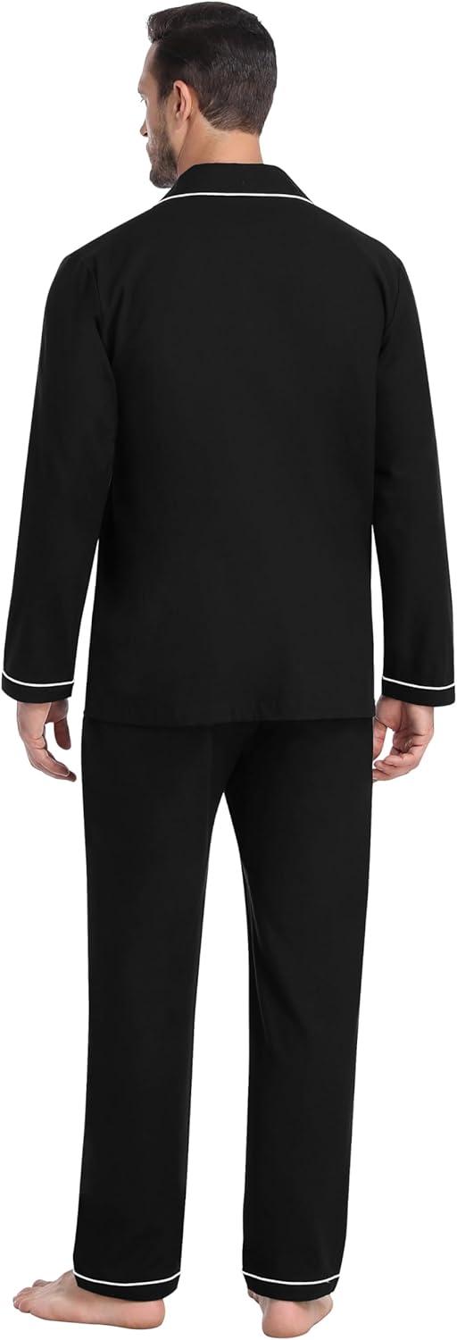 MoFiz Mens Pajama Set Soft Cotton Button Down Notched Collar Pjs Long Sleeve 2 Piece Sleepwear Lounge Nightwear with Pocket(Black)