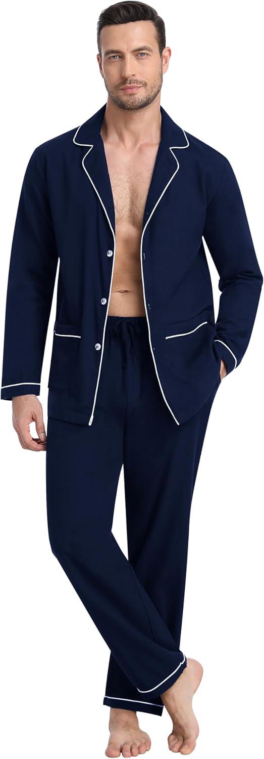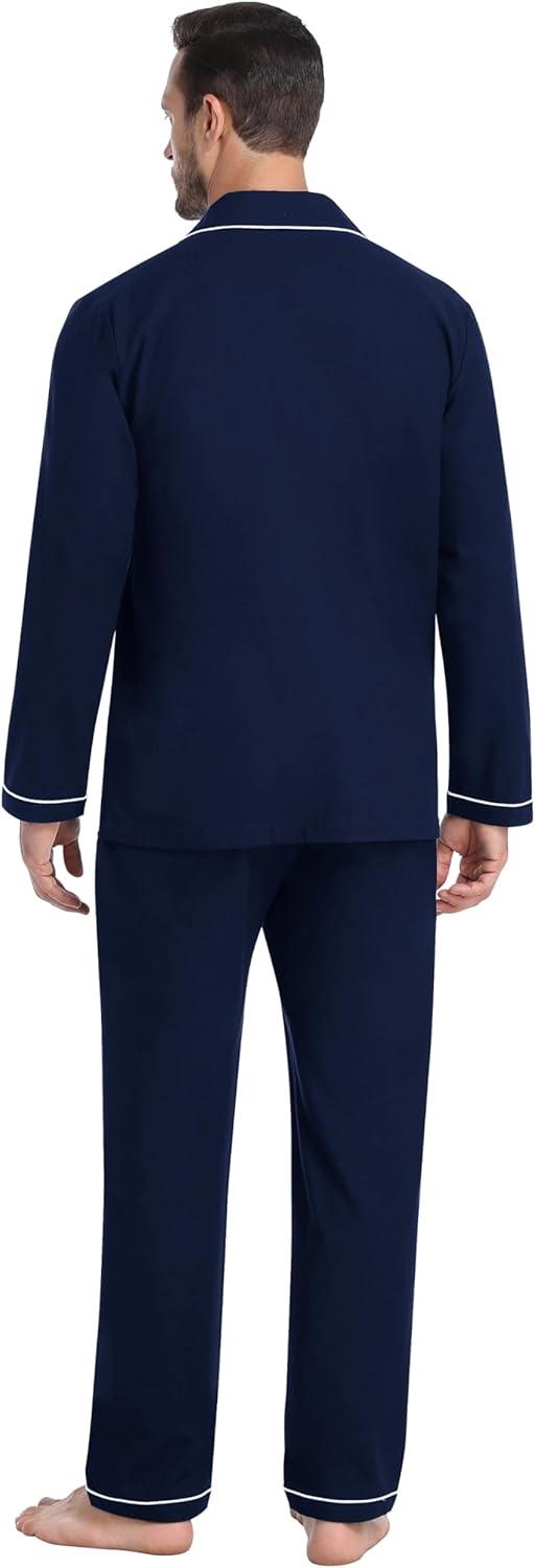 MoFiz Mens Pajama Set Soft Cotton Button Down Notched Collar Pjs Long Sleeve 2 Piece Sleepwear Lounge Nightwear with Pocket(Navy)