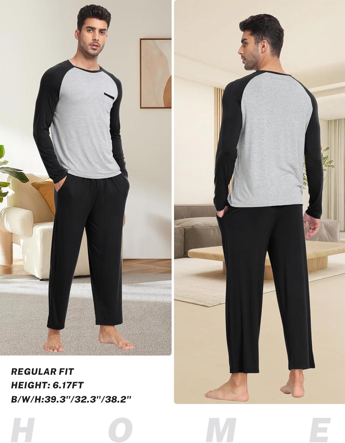 MoFiz Mens Pajama Sets Comfy Long Sleeve Sleepwear Top Solid Pyjama Pants with Pocket 2 Piece Loungewear PJs Sets for Men(Black Grey)