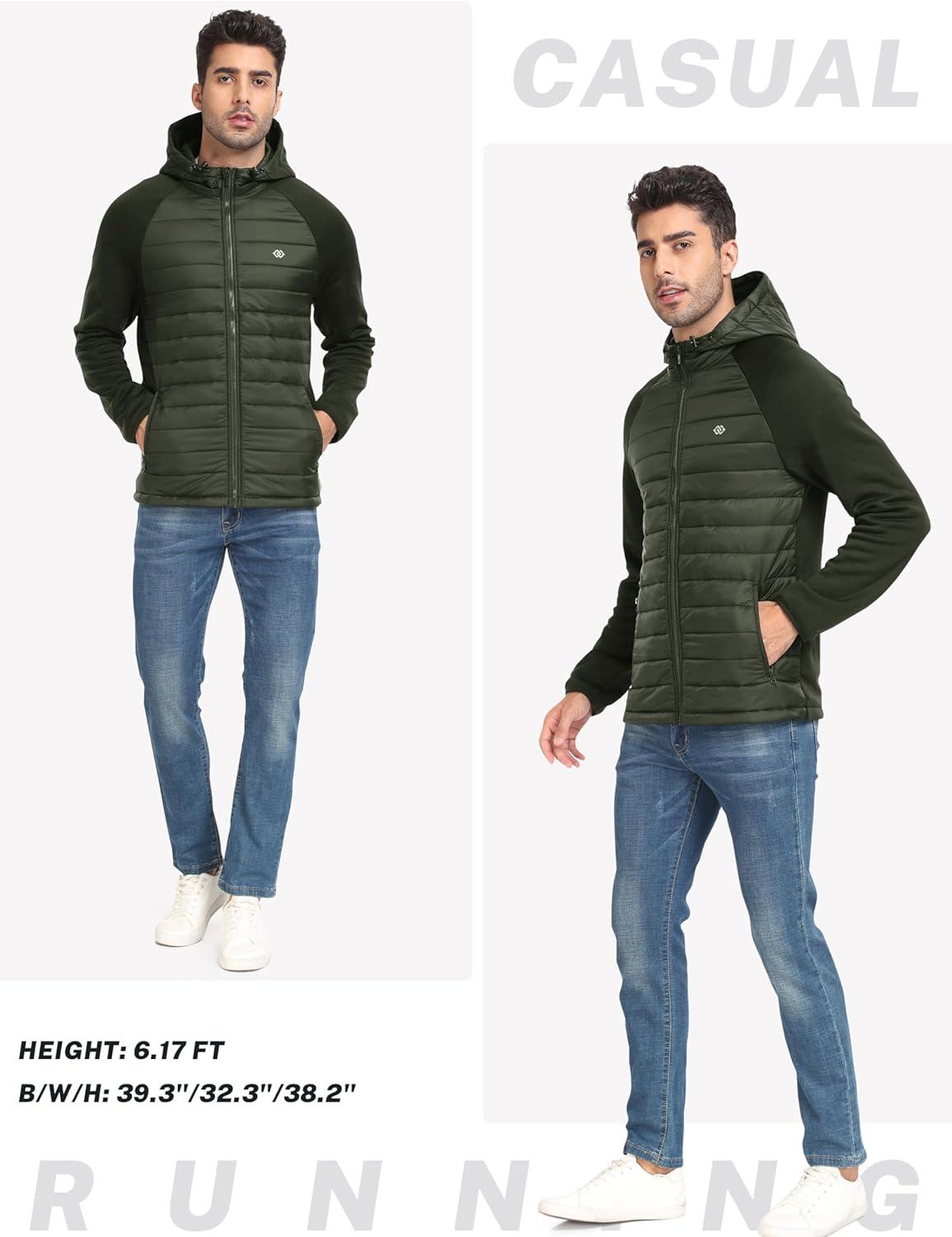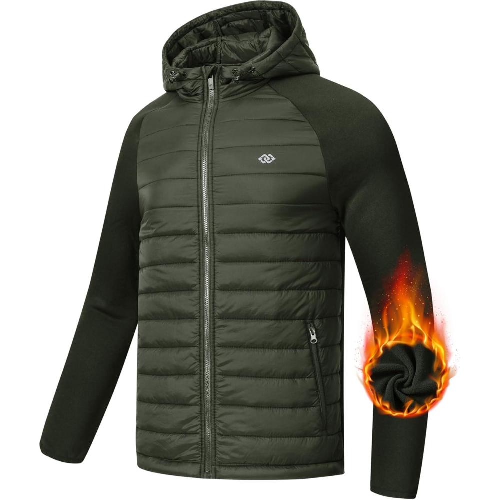 MoFiz Mens Running Hybrid Fleece Jackets Lightweight Puffy Hiking Jacket Winter Thermal Full Zip Hood Insulated Jacket Coat(A-army Green)