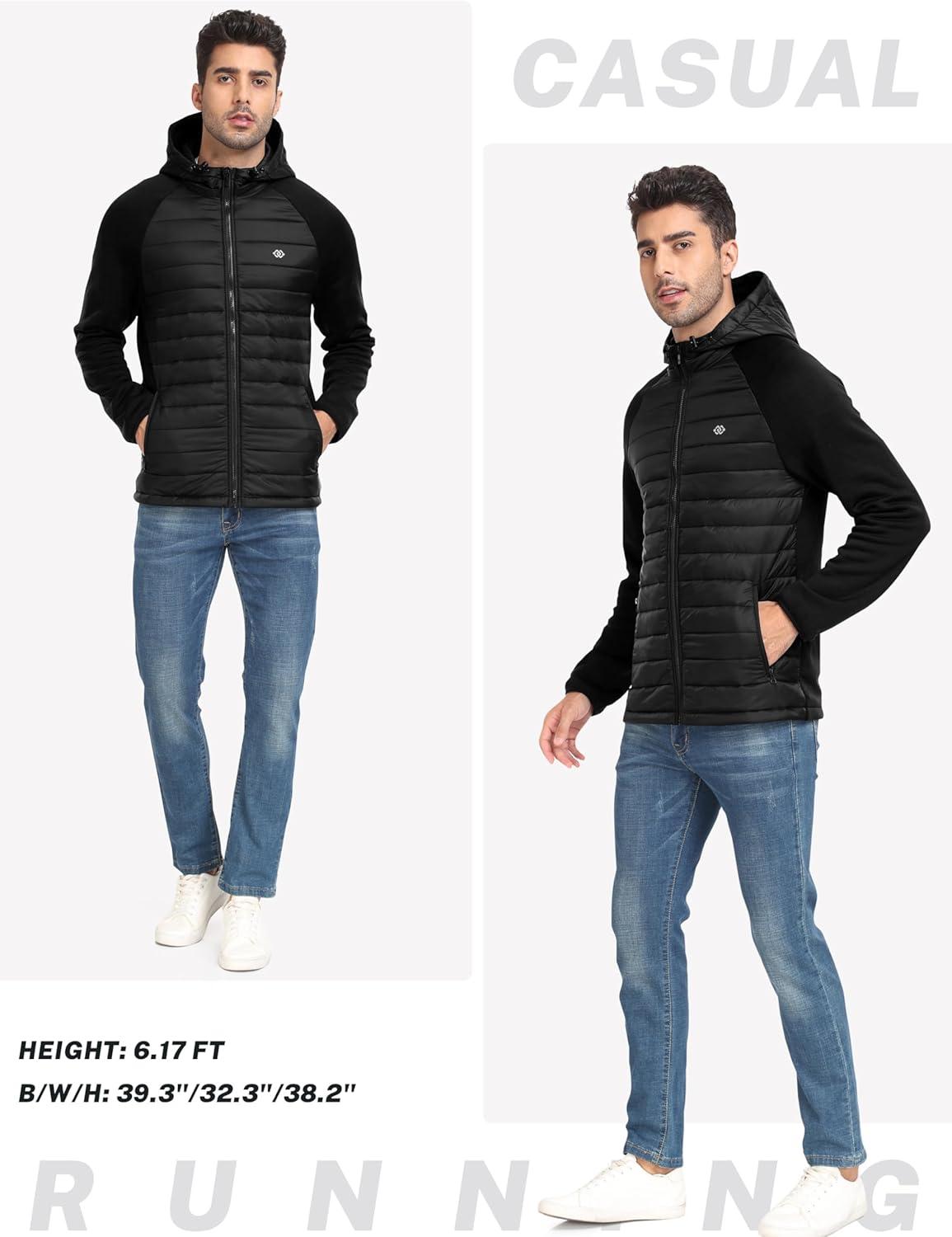 MoFiz Mens Running Hybrid Fleece Jackets Lightweight Puffy Hiking Jacket Winter Thermal Full Zip Hood Insulated Jacket Coat(A-black)