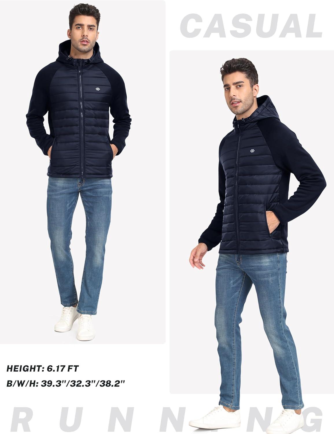 MoFiz Mens Running Hybrid Fleece Jackets Lightweight Puffy Hiking Jacket Winter Thermal Full Zip Hood Insulated Jacket Coat(A-navy)