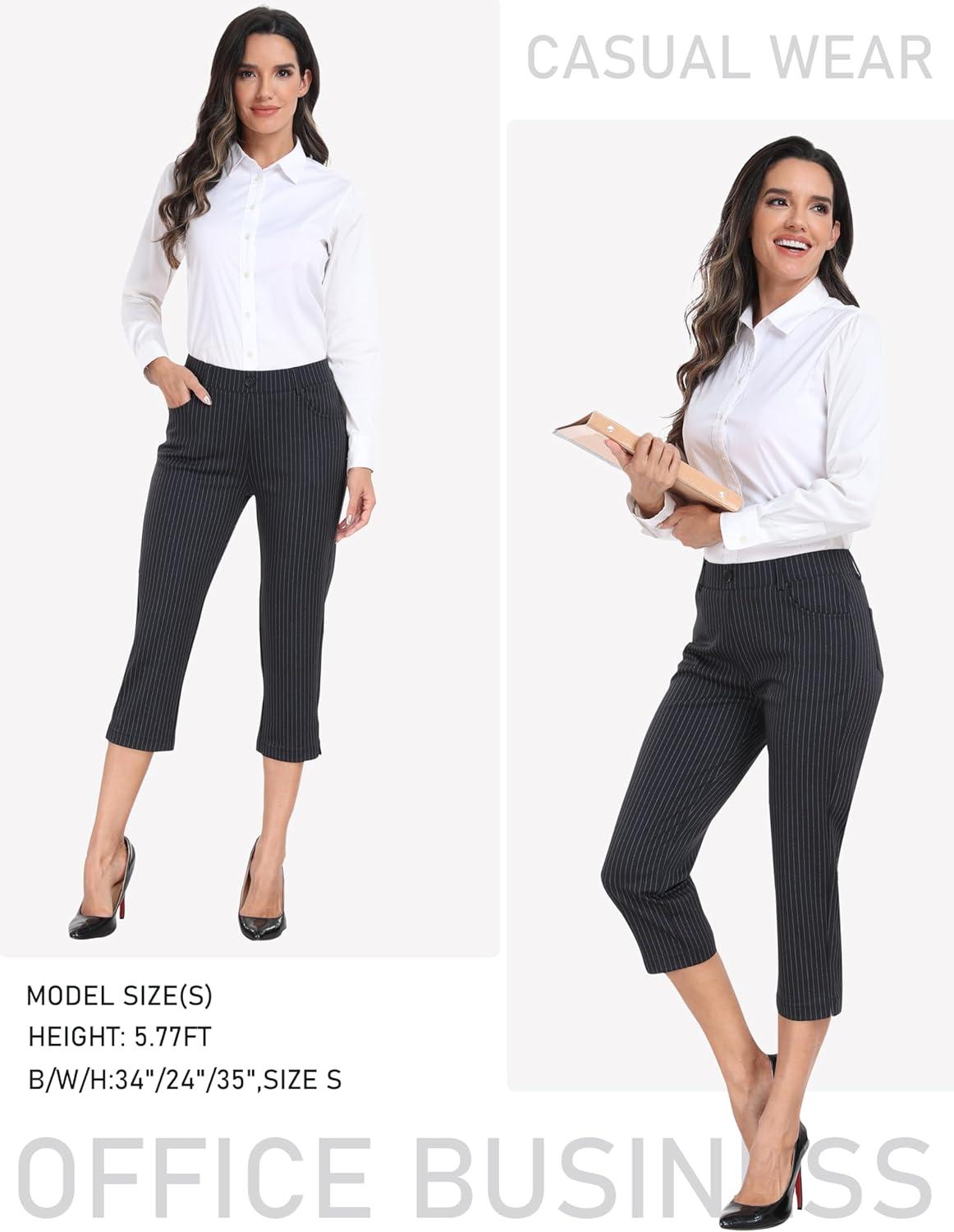MoFiz Women’s Capri Pants Summer Pull-On Stretch Straight Leg Golf Yoga & Business Casual Dressy Cropped Pants with Pockets(Black Pinstripe)