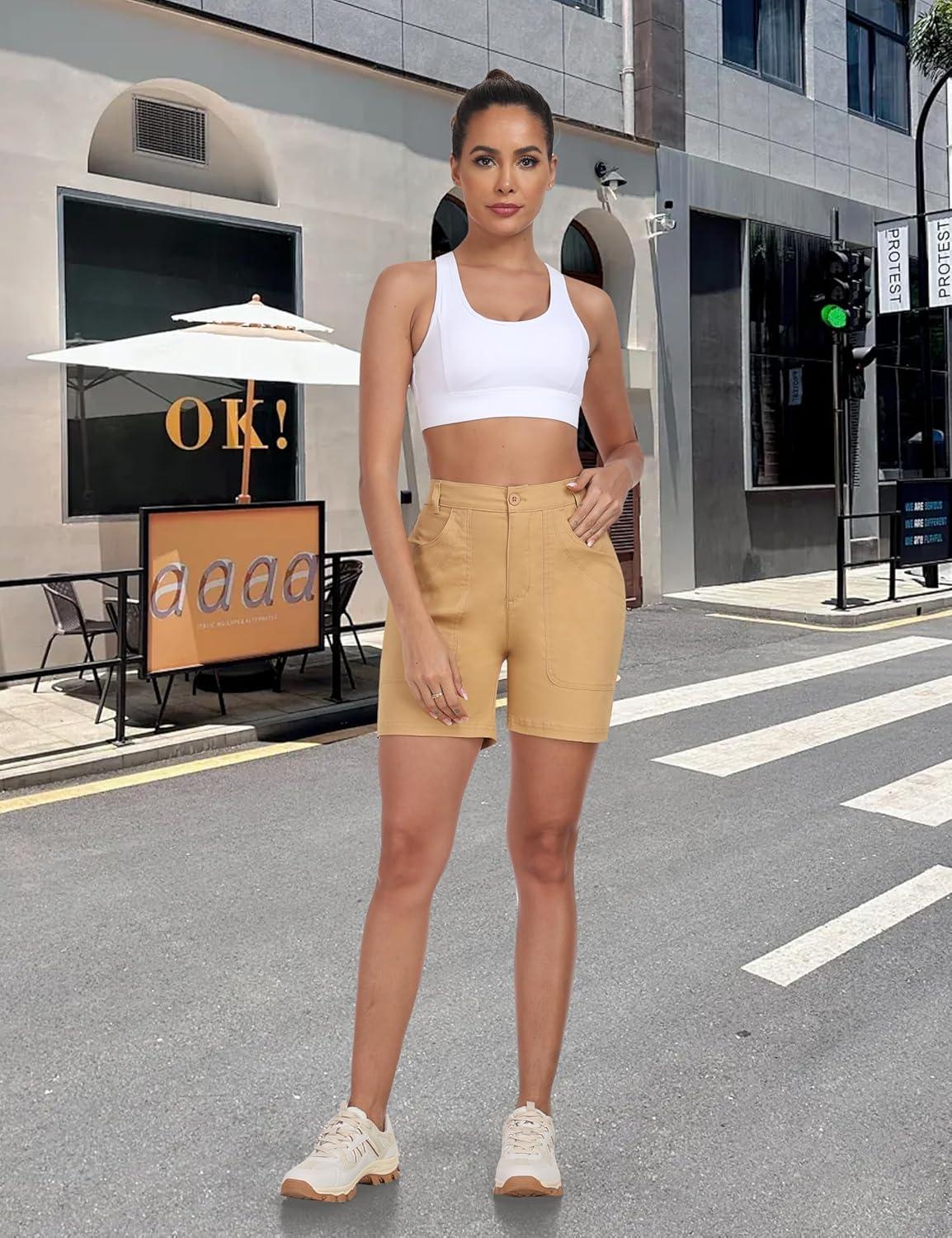 MoFiz Women’s Cotton Bermuda Cargo Shorts 5″ Casual Summer Elastic Waist Trouser Shorts with Pockets(Beige)
