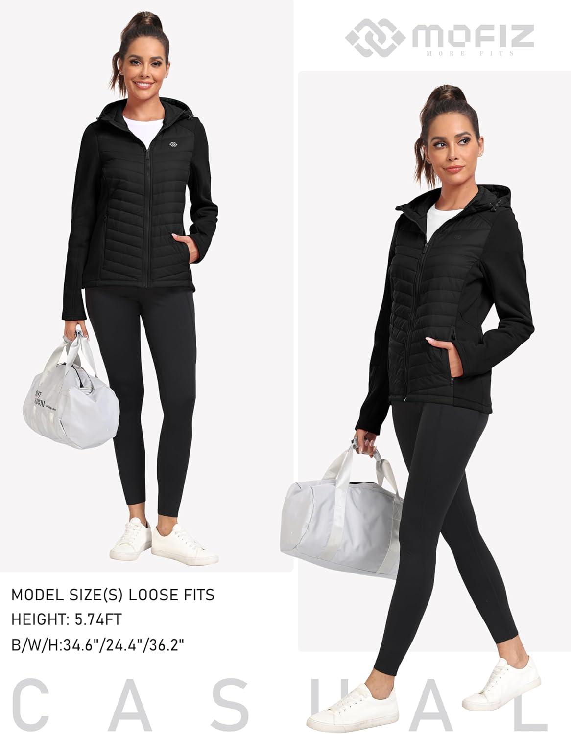 MoFiz Womens Fleece Lined Softshell Jacket Hooded Lightweight Insulated Puffer Hybrid Down Jacket Full Zip Running Coat(Black)