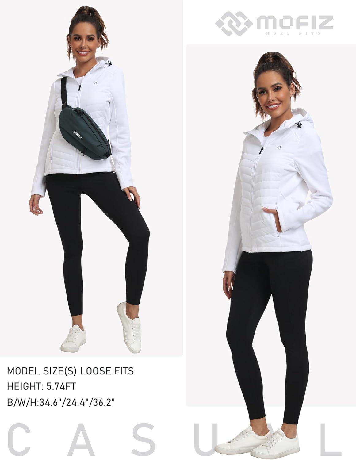 MoFiz Womens Fleece Lined Softshell Jacket Hooded Lightweight Insulated Puffer Hybrid Down Jacket Full Zip Running Coat(White)