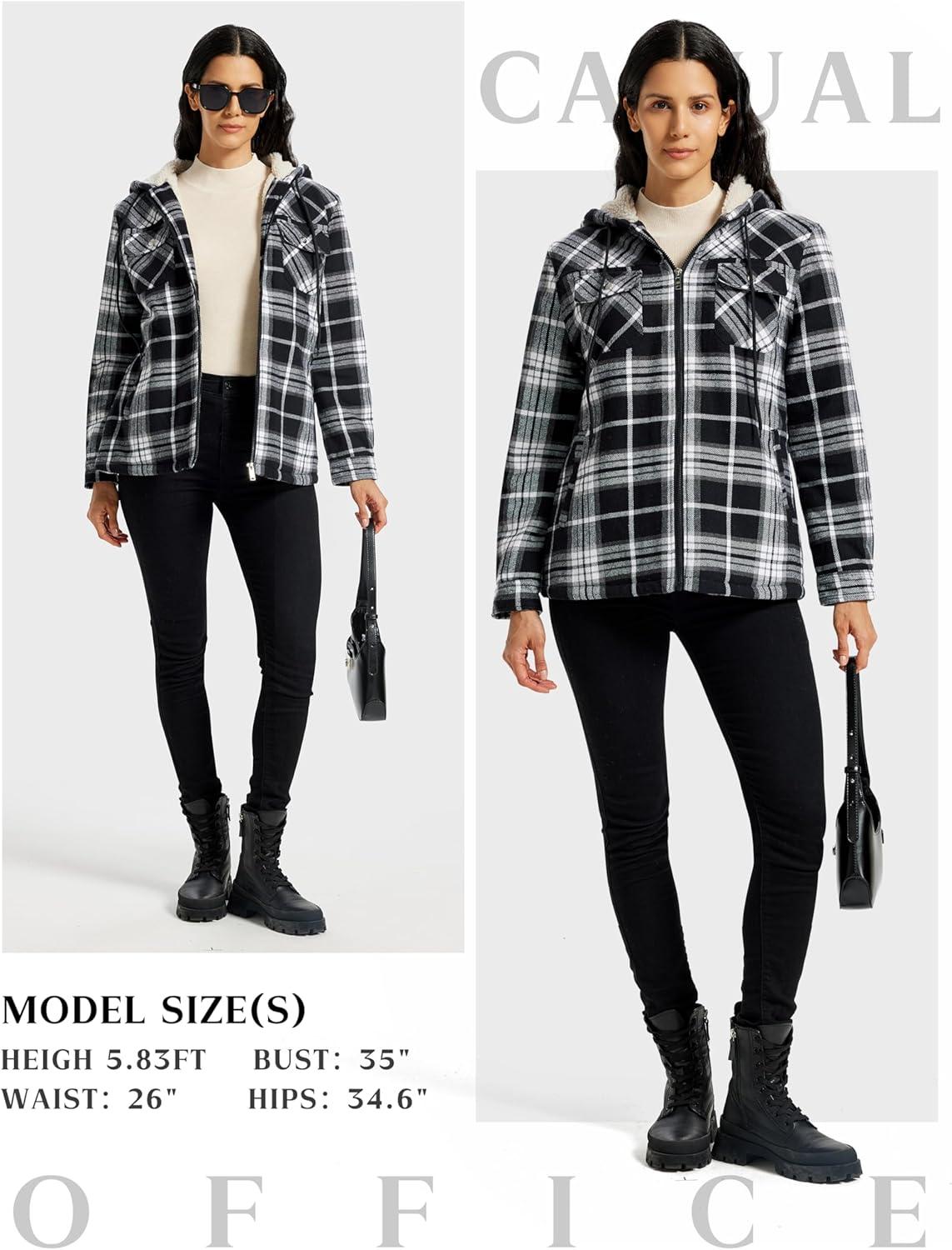 MoFiz Women’s Fleece Zip Up Hoodie Flannel Plaid Hoodie Winter Warm Casual Sweatshirts With Pocket(Y05-black White)