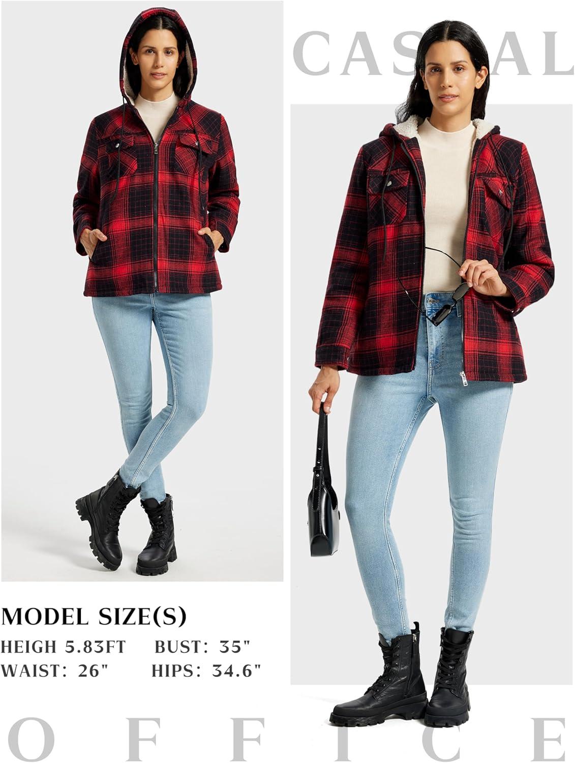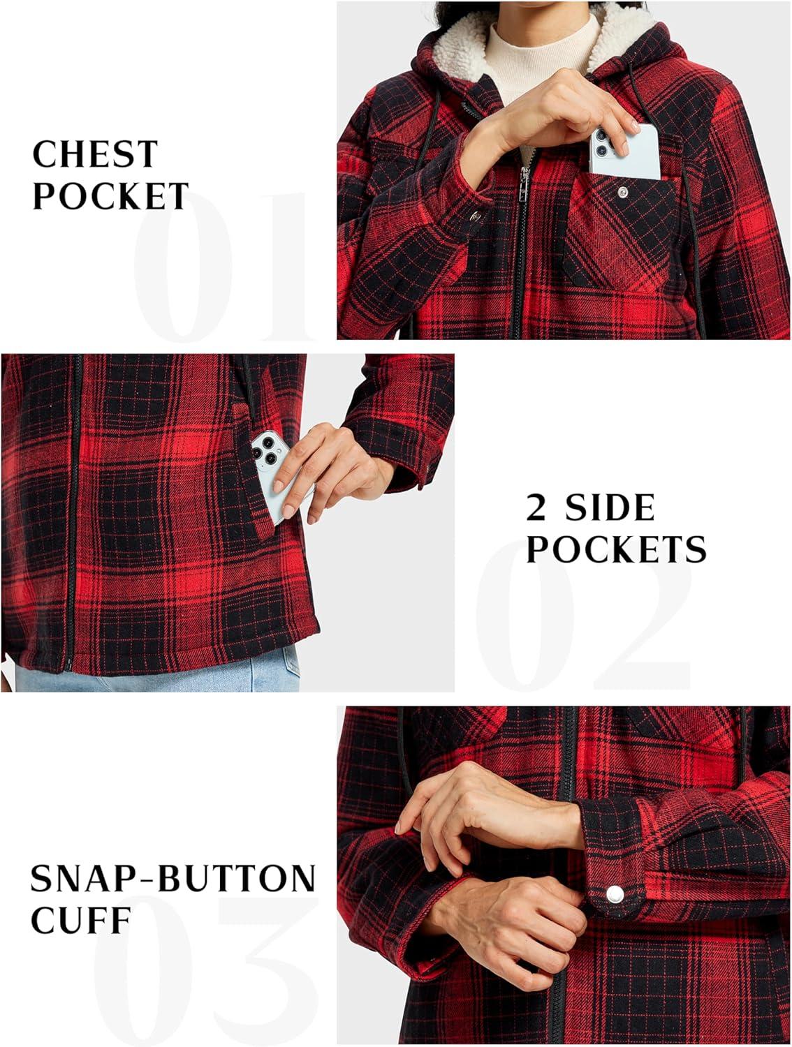 MoFiz Women’s Fleece Zip Up Hoodie Flannel Plaid Hoodie Winter Warm Casual Sweatshirts With Pocket(Y06-black Red)