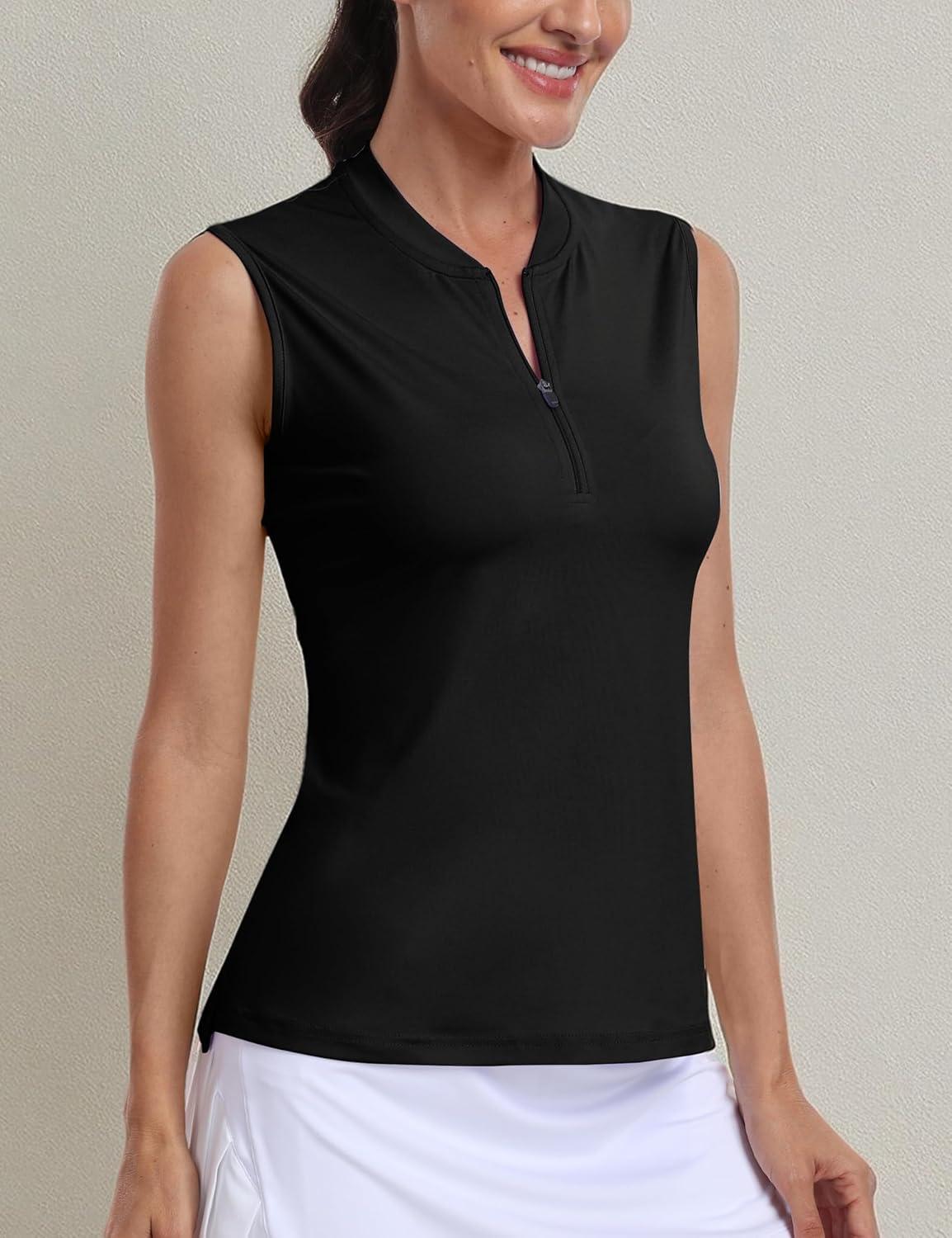 MoFiz Women’s Golf Polo Shirt Sleeveless 1/4 Zip Collarless Tennis Tank Tops Quick-Dry Lightweight Athletic Sport T-Shirt(Black)