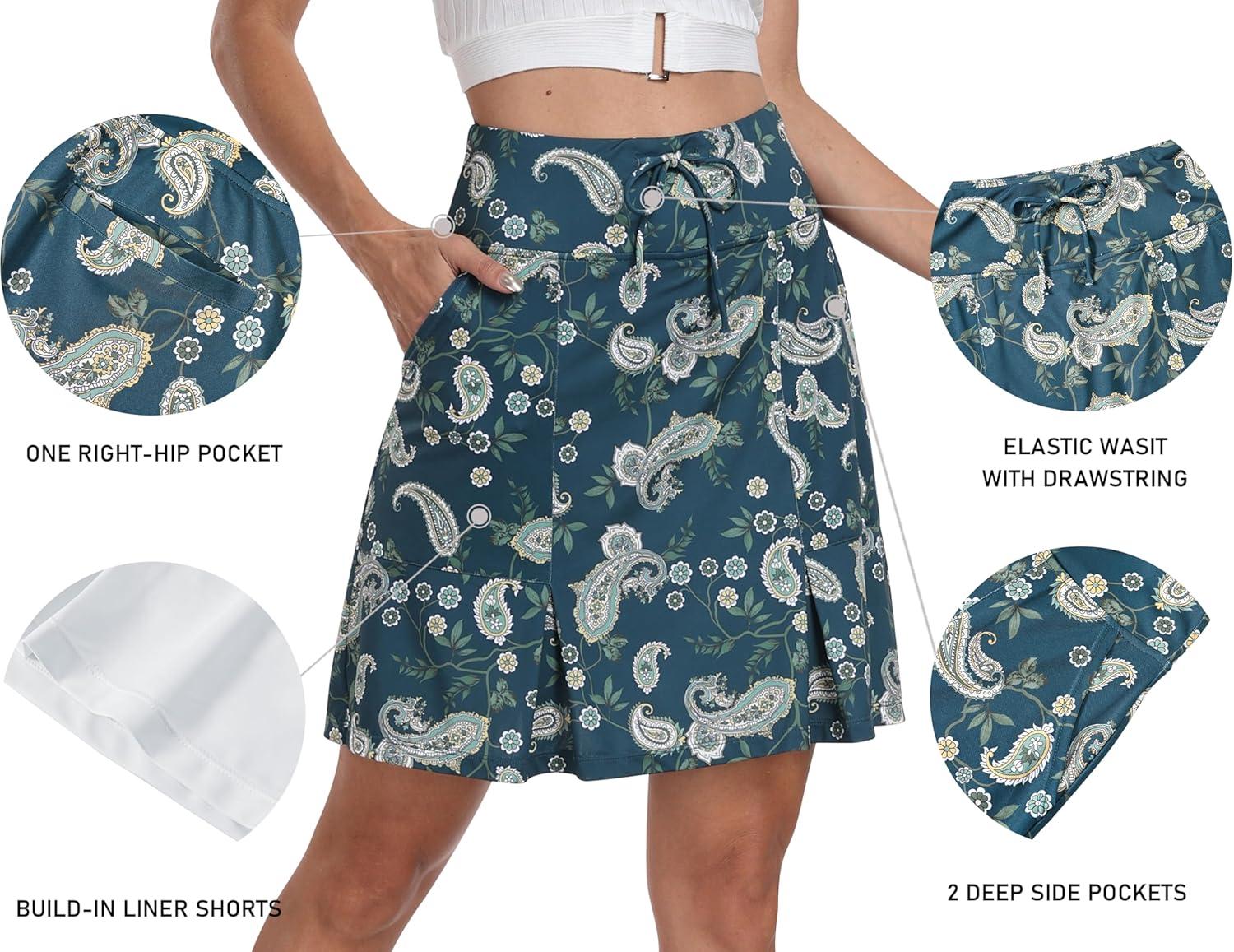MoFiz Women’s Golf Skirts Knee Length Drawstring Athletic Tennis Skort Modest Long Sport Active Casual Summer Skirt Pockets(Green-pattern)