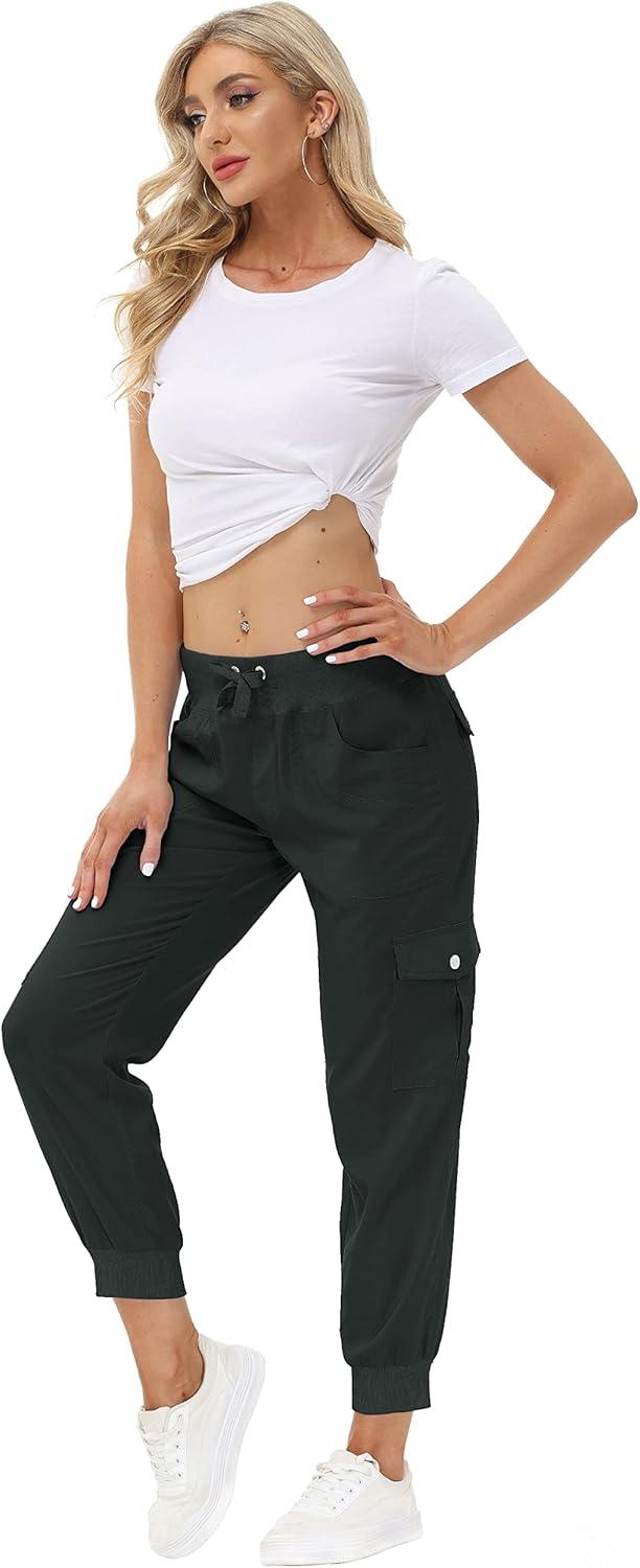 MoFiz Women’s Lightweight Hiking Cargo Pants Outdoor Quick Dry Casual Travel Sweatpants Joggers Elastic Waist Button Pockets(A07-dark Grey)