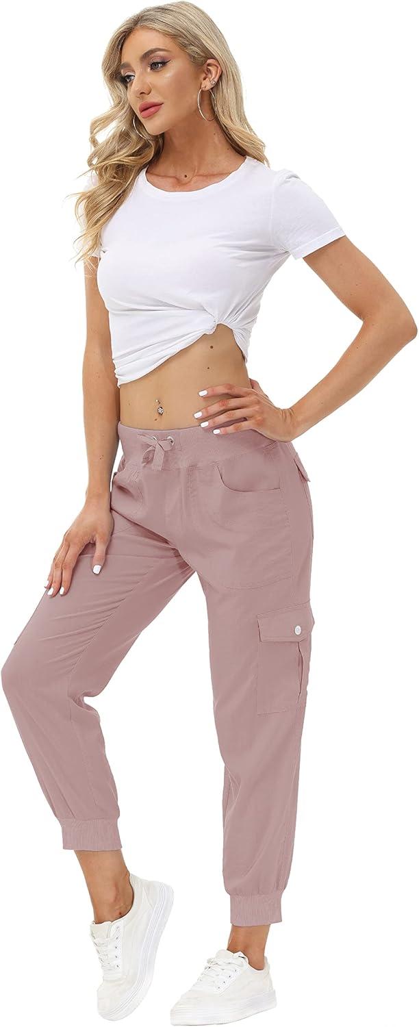 MoFiz Women’s Lightweight Hiking Cargo Pants Outdoor Quick Dry Casual Travel Sweatpants Joggers Elastic Waist Button Pockets(A11-dusty Pink)