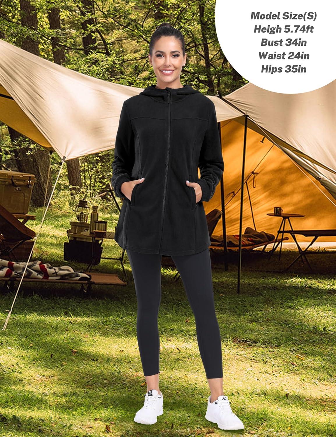 MoFiz Women’s Long Polar Fleece Jacket Full Zip Up with Hood Lightweight Soft Fleece Coat for Travel & Winter Athletic Wear(Jacket-black)