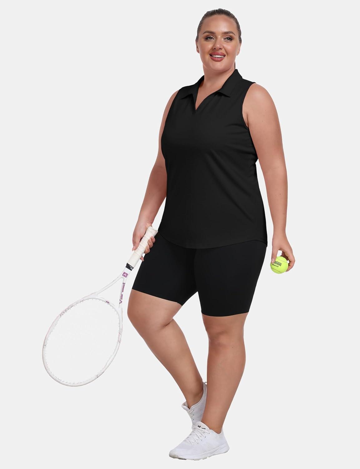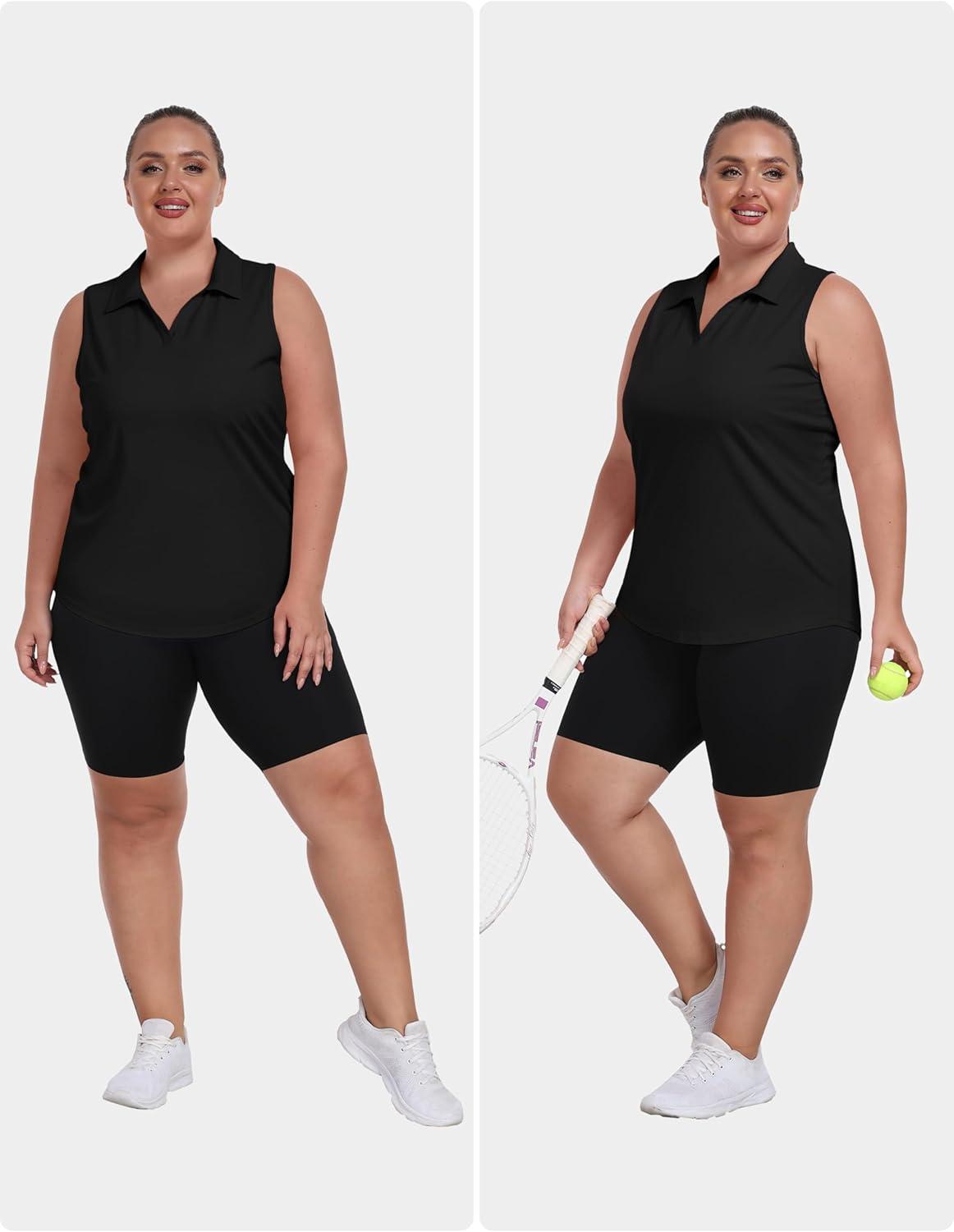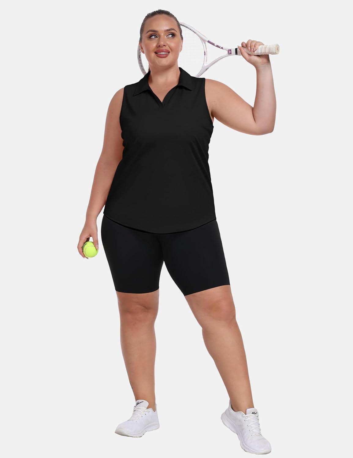 MoFiz Women’s Plus Size Golf Polo Shirt Sleeveless Racerback Tennis Tank Tops V-Neck Collared Loose Fit Athletic T-Shirt(Black)