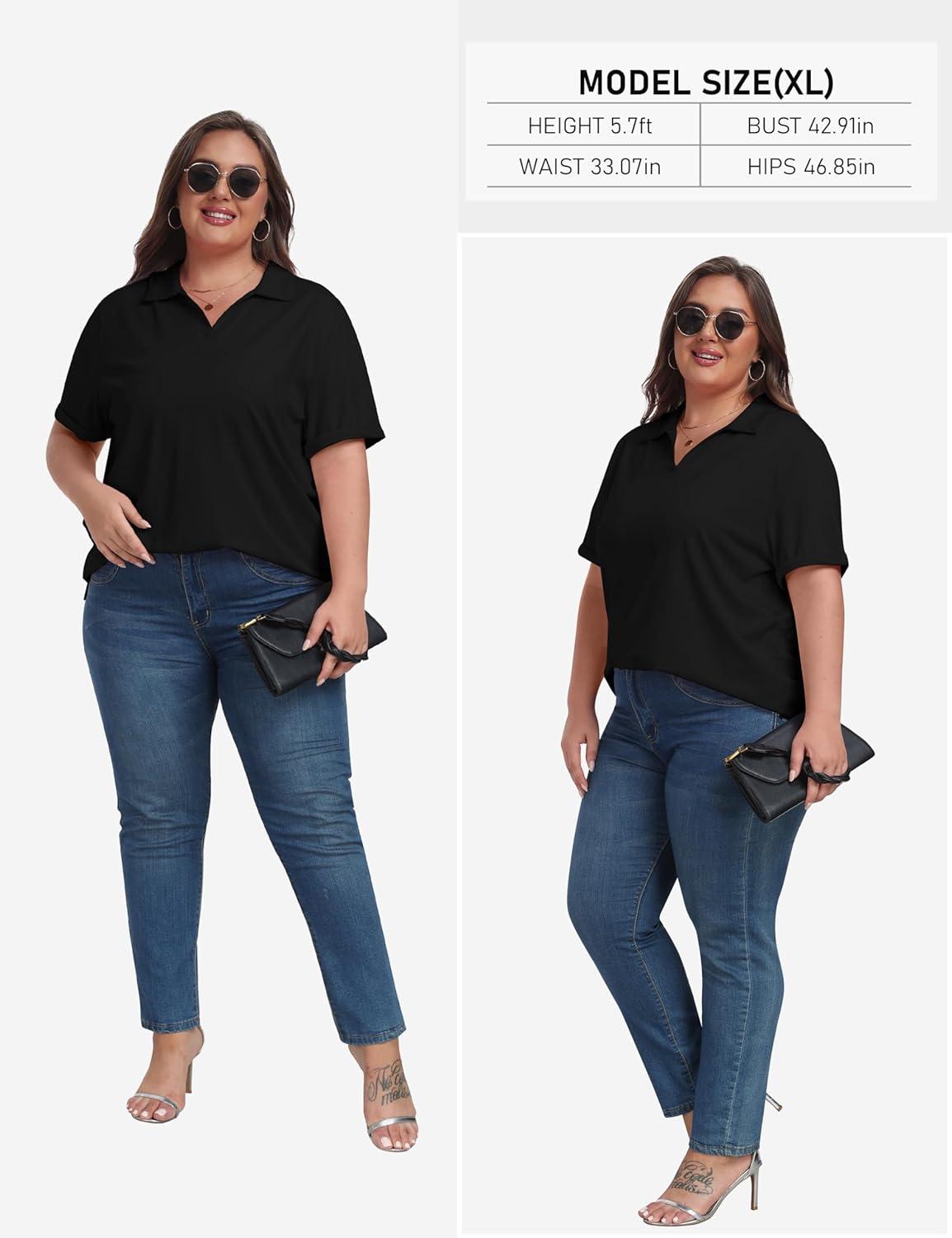 MoFiz Women’s Plus Size Golf Polo Shirts Loose Fit Short Sleeve V-Neck Tennis Workouts Tops, XL-5XL(Black)