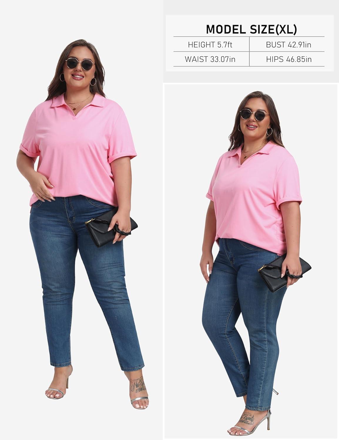 MoFiz Women’s Plus Size Golf Polo Shirts Loose Fit Short Sleeve V-Neck Tennis Workouts Tops, XL-5XL(Pink)