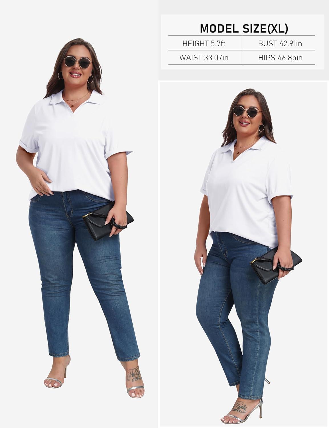 MoFiz Women’s Plus Size Golf Polo Shirts Loose Fit Short Sleeve V-Neck Tennis Workouts Tops, XL-5XL(White)